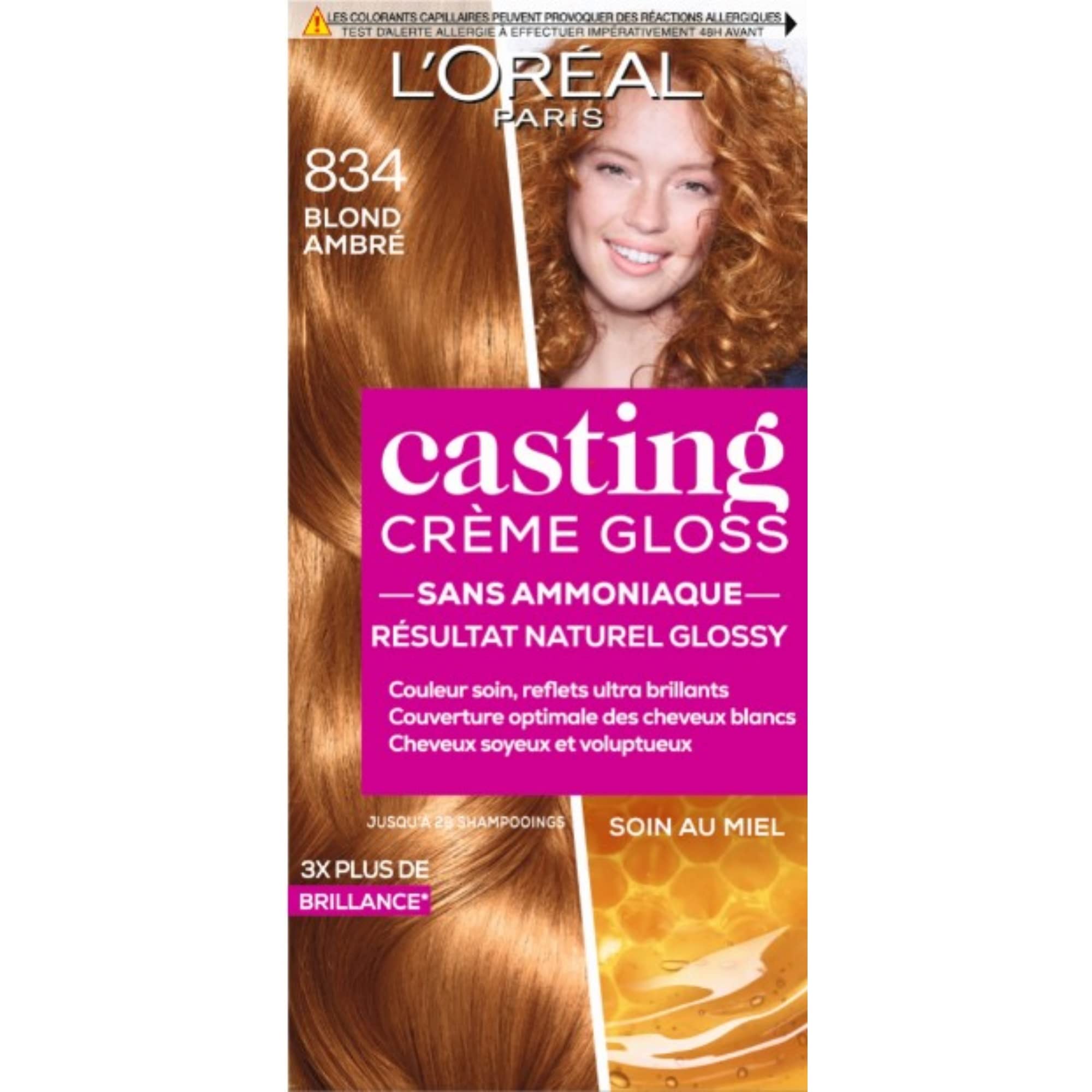 Casting Crème Gloss, the ideal first-time hair color: an ammonia-free cream formula for a tone-on-tone result, close to your natural color. An ultra-glossy color with brilliant highlights and optimal coverage of gray hair. It's you, but better. Its cream formula optimally covers gray hair, up to 70 . To choose your color, make sure that your current hair color matches one of the colors that appear on the back of the pack (in the photo). If you hesitate between 2 shades, always choose the lighter one. INGREDIENTS Casting Crème Gloss Ammonia-Free Tone-On-Tone Hair Color 834 Amber Blonde INSTRUCTIONS FOR USE - DISCLAIMER Photography not contractual. The above indications are given for information purposes only. They are not necessarily exhaustive and cannot replace the information appearing on the product packaging, which alone is authentic and to which you are invited to refer, particularly in the event of food intolerance. Contents: 1x L'Oréal Paris Casting Crème Gloss Hair Color, Shade: Amber Blonde (834), Includes: 1 coloring cream (48 ml), 1 developer milk (72 ml), 1 treatment enriched with Honey (60 ml), 1 pair of gloves, 1 instruction leaflet. Ammonia-free formula with a cream texture, Nourishing treatment included to enhance the color and soften the hair, Ultra-practical applicator bottle for great precision. Directions for use: Perform an allergy test 48 hours before application, Read the instructions carefully before any application, Recommended quantity: 1 box (medium-length hair), 2 boxes (long hair). Results: An ultra-glossy and natural color, full of nuances thanks to delicious highlights and exceptional shine, Coverage of gray hair up to 70 . Non-permanent coloring in an amber blonde shade, Suitable for blonde hair, Lasts up to 28 shampoos. Casting Crème Gloss, la coloration idéale des 1ères fois : une formule crème sans ammoniaque pour un résultat ton sur ton, proche de sa couleur naturelle. Une couleur ultra-glossy aux reflets brillants et une couverture optimale des cheveux blancs. C'est vous, mais en mieux. Sa formule crème recouvre les cheveux blancs de façon optimale, jusqu'à 70 . Pour choisir votre coloration, assurez-vous que la couleur actuelle de vos cheveux correspond à l'une des couleurs qui apparait sur le dos du pack (en photo). Si vous hésitez entre 2 nuances, choisissez toujours la plus claire. INGRÉDIENTS Casting Crème Gloss Coloration Ton Sur Ton Sans Ammoniaque 834 Blond Ambré MODE D'EMPLOI - CLAUSE DE NON-GARANTIE Photographie non contractuelle. Les indications ci-dessus sont données à titre d'information. Elles ne sont pas forcément exhaustives et ne sauraient se substituer aux informations figurant sur l'emballage du produit qui font seules foi, et auxquelles vous êtes invités à vous reporter, notamment en cas d'intolérance alimentaire. Contenu : 1x Coloration Casting Crème Gloss L'Oréal Paris, Nuance : Blond Ambré (834), Inclus : 1 crème colorante (48 ml), 1 lait révélateur (72 ml), 1 soin enrichi en Miel (60 ml), 1 paire de gants, 1 notice d'utilisation. Formule sans ammoniaque à la texture crème, Soin nourrissant inclus pour sublimer la couleur et assouplir la chevelure, Flacon applicateur ultra-pratique pour une grande précision. Conseils d'utilisation : Réaliser un test d'allergie au préalable 48h avant application, Lire attentivement la notice avant toute application, Quantité recommandée : 1 boîte (cheveux mi-longs), 2 boîtes (cheveux longs). Résultats : Une couleur ultra-glossy et naturelle, pleine de nuances grâce à des reflets gourmands et une brillance exceptionnelle, Couverture des cheveux blancs jusqu' à 70 . Coloration non permanente à la nuance blond ambré, Convient aux cheveux blonds, Tenue jusqu'à 28 shampooings.