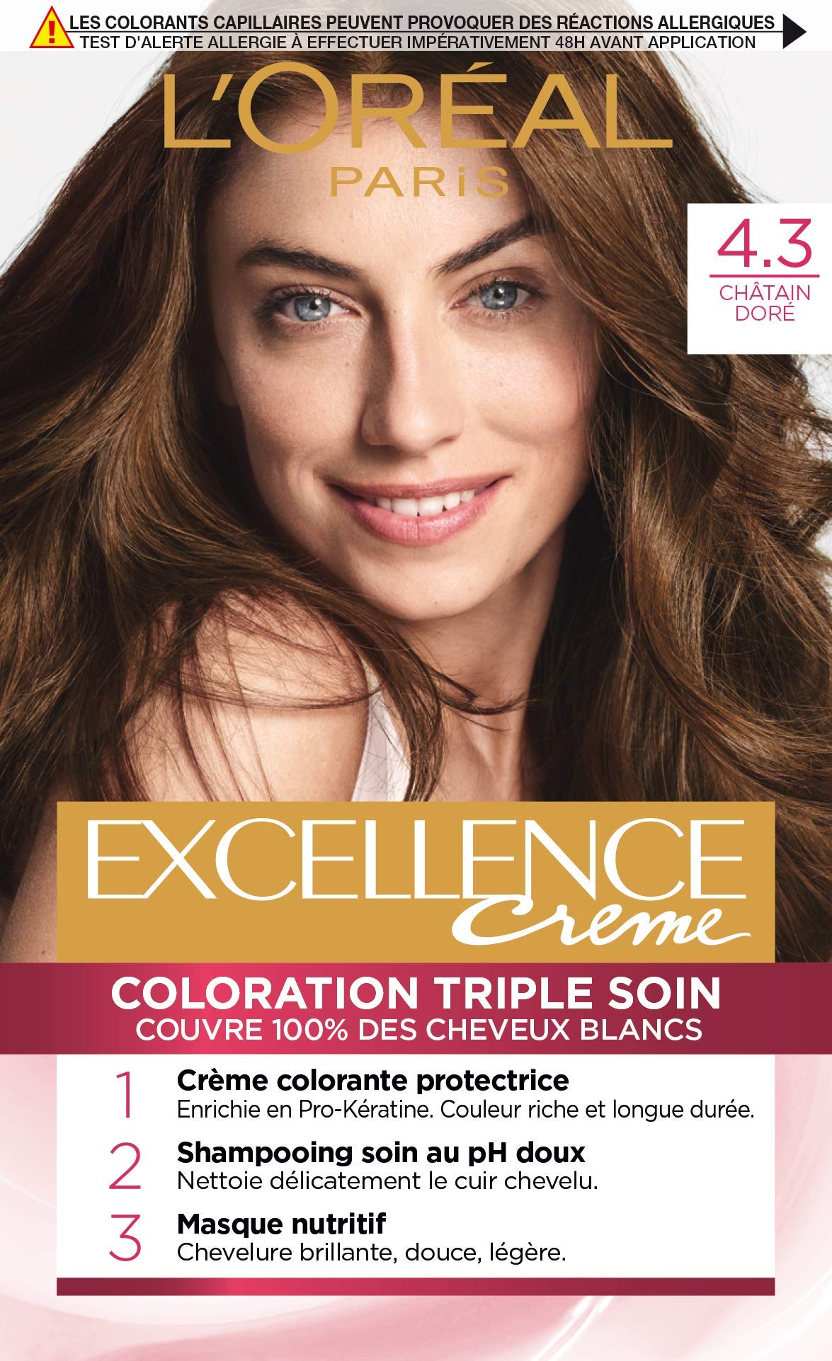 L'Oréal Paris Excellence crème 4.3 Golden Brown, Triple care permanent hair color - covers 100 of white hair New excellence crème, the hair color that respects you thanks to its new triple care ritual. 1) respects the hair thanks to the protective coloring cream. INSTRUCTIONS FOR USE Add the coloring cream (1a) to the developer (1b), shake the mixture well so that it is homogeneousSun protection: Non-sun protection factor. Add the coloring cream (1a) to the developer (1b), shake the mixture well so that it is homogeneous. Your color is rich and homogeneous, your hair supple and shiny. New excellence cream, the coloring that respects you thanks to its new triple care ritual. 1) respects the hair thanks to the protective coloring cream. Permanent triple care coloring - covers 100 percent of gray hair. L'Oréal Paris Excellence crème 4.3 Châtain doré, Coloration permanente triple soin - couvre 100 des cheveux blancs Nouveau excellence crème, la coloration qui vous respecte grâce à son nouveau rituel triple soin. 1) respecte le cheveu grâce à la crème colorante protectrice. MODE D'EMPLOI Ajoutez la crème colorante (1a) au révélateur (1b), secouez bien le mélange pour qu'il soit homogèneProtection solaire : Facteur de protection non solaire. Ajoutez la crème colorante (1a) au révélateur (1b), secouez bien le mélange pour qu'il soit homogène. Votre couleur est riche et homogène, vos cheveux souples et brillants. Nouveau excellence crème, la coloration qui vous respecte grâce à son nouveau rituel triple soin. 1) respecte le cheveu grâce à la crème colorante protectrice. Coloration permanente triple soin - couvre 100 percent des cheveux blancs.