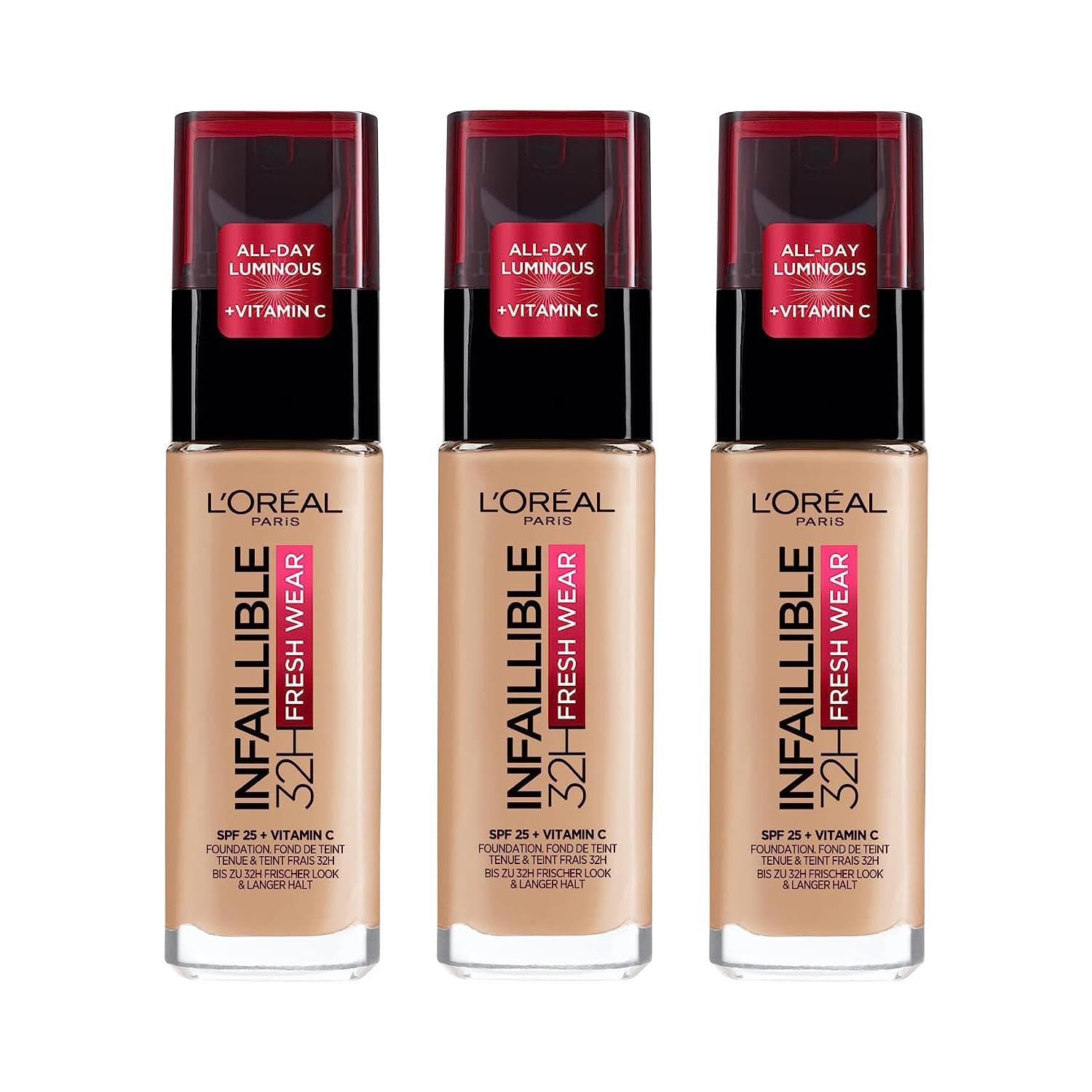 Beschreibung Das Infaillible 24H Fresh Wear Make-up mit atmungsaktiver Oxygen technology verleiht ein schwereloses Tragefühl und non-stop frisches Aussehen. 24 Stunden Perfection, 24 Stunden Comfort. 24 Stunden Perfection, 24 Stunden Comfort. Dank der waterfesten Formulaierung können weder Regen, Hitze, Sport oder Tränen Ihrem Make-up etwas anhaben. The atmospheric Oxygen Technology releases a lot of food and non-stop fries. Anwendung: Flüssig-Make-up mit hoher Deckkraft für einen langanhaltend perfektionierten Teint, ganz ohne Masken-Effekt. The atmospheric Oxygen Technology is designed to provide comfort and fresh air. Thanks to the resistance to washing and fading, the foundation is also ideal for sports - Kein Abfärben oder schmieren. SAFETY WARNING For external use only. Avoid contact with eyes. Keep away from naked flame or direct heat sources.Brand: L'ORÉAL. L'Oréal Paris Infallible Fresh Wear 24h Liquid Foundation 140 Golden Beige, Pack of 3 3 x 30 ml. Beschreibung Das Infaillible 24H Fresh Wear Make-up mit atmungsaktiver Oxygen technology verleiht ein schwereloses Tragefühl und non-stop frisches Aussehen. 24 Stunden Perfektion, 24 Stunden Komfort. 24 Stunden Perfektion, 24 Stunden Komfort. Dank der wasserfesten Formulierung können weder Regen, Hitze, Sport oder Tränen Ihrem Make-up etwas anhaben. Die atmungsaktive Oxygen Technology verleiht ein schwereloses Tragegefühl und non-stop frisches Aussehen. Anwendung : Flüssig-Make-up mit hoher Deckkraft für einen langanhaltend perfektionierten Teint, ganz ohne Masken-Effekt. Die atmungsaktive Oxygen Technology sorgt für einen schwerelosen Tragekomfort und ein dauerhaft frisches Aussehen. Grâce à la résistance au lavage et à la décoloration, le fond de teint est également idéal pour le sport - Kein Abfärben oder schmieren. AVERTISSEMENT DE SÛRETÉ Pour une utilisation externe uniquement. Avoid contact with eyes. Keep away from naked flame or direct heat sources.Marque: L'ORÉAL. L'Oréal Paris Fond de Teint Liquide Infallible Fresh Wear 24h 140 Beige Doré, Lot de 3 3 x 30 ml.