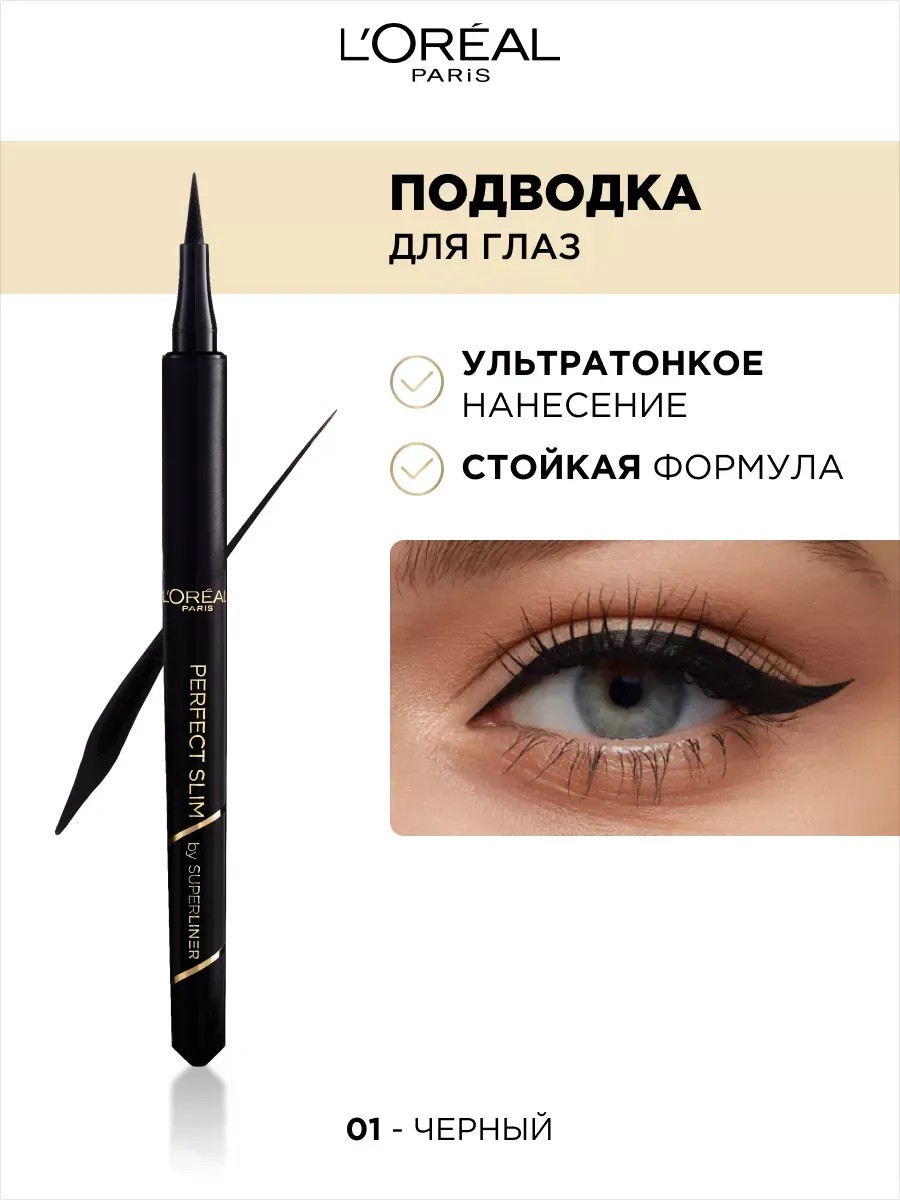 Суперлайнер "Perfect Slim":экстрачерная жидкая классическая подводка для макияжа глаз L'Oreal Paris (Лореаль Париж) - идеально тонкие линии и стрелки одним движением. Благодаря специальной зоне захвата нанесение стало более контролируемым и простым. А ультратонкий фетровый аппликатор с легкостью позволяет выполнять четкие линии любой толщины и формы. Сатиновая формула, насыщенная ультраинтенсивными пигментами, быстро фиксируется, не тускнеет и не растекается на протяжении всего дня. Твои линии, твои правила!