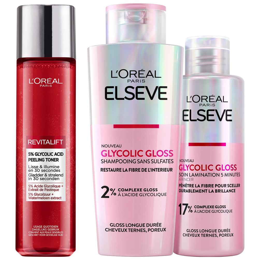 Elsève Glycolic Gloss: Shiny hair is healthy hair: its surface perfectly reflects light. External factors can damage the hair cuticle: the fiber then becomes rough, porous, and dull, unable to reflect light. The complete Glycolic Gloss at-home hair care routine, enriched with Glycolic Acid, restores the fiber from within to significantly improve hair quality and coat it with long-lasting shine. Results? Hair is 2x shinier , 88 softer for a transformation that lasts up to 10 shampoos . Application: On wet hair, apply the Sulfate-Free Shampoo . Complete the routine with the Lamination Treatment, an essential step in the protocol. Leave on for 5 minutes before rinsing. Our commitment doesn't stop at the beauty of your hair: for over 30 years, L'Oréal has been committed to beauty without animal testing. The bottles are made from 100 recycled plastic and are recyclable. Instrumental test after application of shampoo conditioner. Instrumental test after application of shampoo conditioner laminating treatment. Instrumental test after one application of shampoo conditioner laminating treatment and 10 applications of shampoo. Sulfate-free surfactants. L'Oréal Paris Revitalift: A radiant complexion in 30 seconds? Try the L'Oréal Paris Revitalift Peeling Toner Daily Exfoliating Lotion with 5 Glycolic Acid. The Peeling Toner is a new beauty step, somewhere between cleansing and skincare. It gently exfoliates skin imperfections by removing dead cells. Indeed, with age, the skin's cell renewal process gradually slows down. Dullness and unevenness can then appear. Thanks to Glycolic Acid, a leading active ingredient in dermatology known for its exfoliating, unclogging, and astringent properties, Revitalift Peeling Toner prevents the accumulation of sebum that clogs pores by removing dead skin cells from the top layer of the epidermis. It also promotes cell renewal, bringing radiance even to the dullest complexions. Concentrated at 5 to guarantee the best balance between effectiveness and tolerance, Revitalift Peeling Toner is suitable for all skin types and tones. Its non-sticky and non-oily texture allows it to penetrate the skin quickly and gently. Ideal for daily use, the Peeling Toner gives skin a radiant boost for a guaranteed glow! In 30 seconds: Skin quality is improved. Skin is softer and more luminous. In 4 weeks: Skin texture appears refined. Imperfections are less visible. In 8 weeks: Dark spots are reduced. Instructions for use: On wet hair, apply shampoo, rinse, apply the Lamination treatment to damp hair for 5 minutes, rinse. For the peel, apply every morning and or evening using a cotton pad to a previously cleansed face and neck. Safety Warning: The ingredient lists for our brand's products are regularly updated. Before using any of our brand's products, please read the ingredient list on the packaging to ensure the ingredients are suitable for your personal use. See more