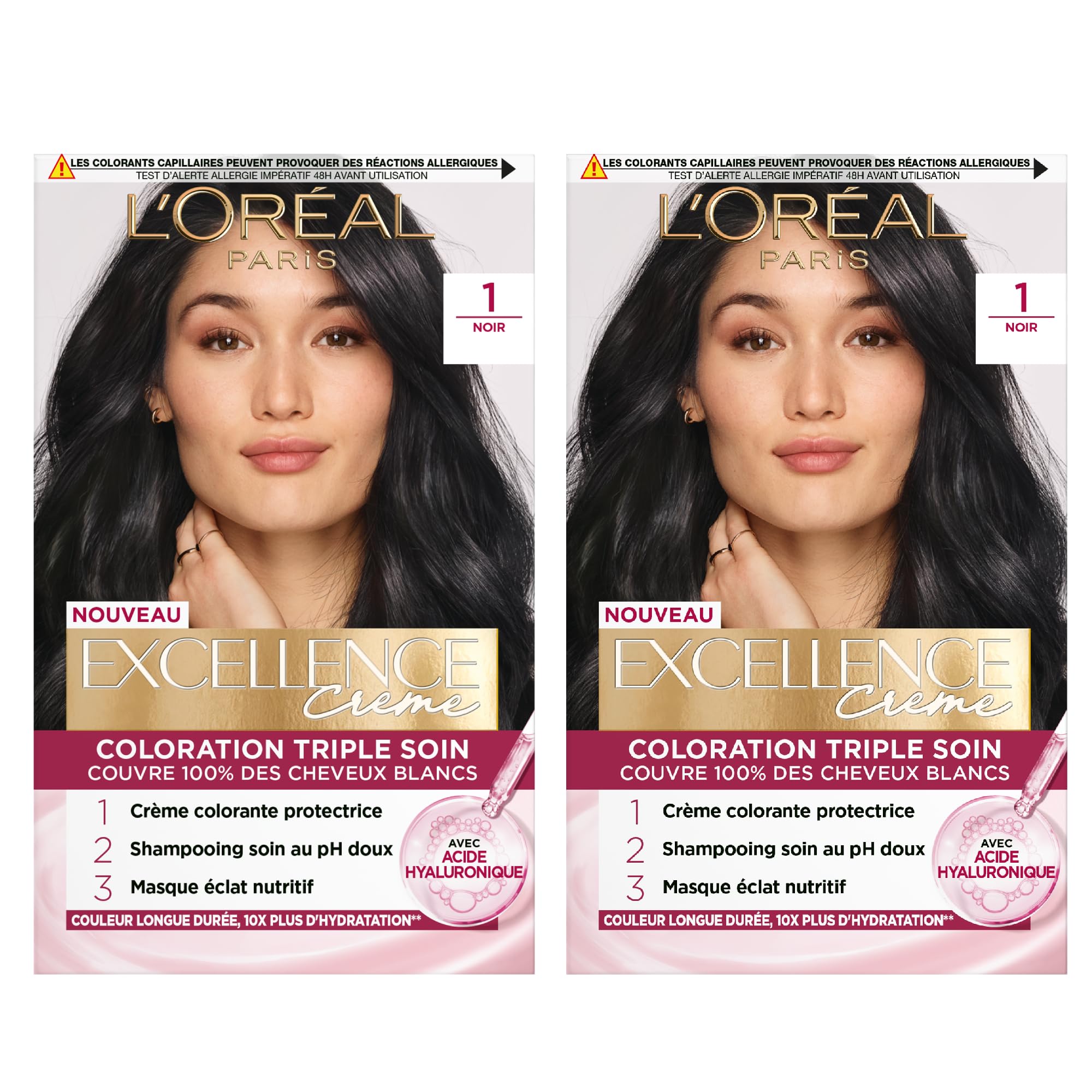 L'Or al Paris Teinte Permanente Excellence Cr mes 1 Noir Coloration Triple Traitement Longue Dur e avec Acide Hyaluronique Couverture 100% Cheveux Blancs - 2 Teintes
