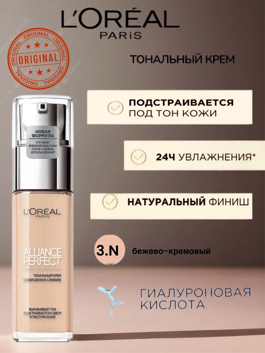 Жидкий тональный крем ALLIANCE PERFECT - АЛЬЯНС ПЕРФЕКТ от L'Oreal Paris (Лореаль Париж) выравнивает тон, подстраивается к цвету и текстуре кожи. Заметно преображает кожу за 2 недели применения: кожа более гладкая и сияющая. Ультра-тонкие пигменты подстраиваются под тон и подтон кожи. Формула на 80%, состоящая из увлажняющего крема с гиалуроновой кислотой. 24 часа увлажнения вашей кожи. Естественный финиш, сияющая кожа. SPF 16.