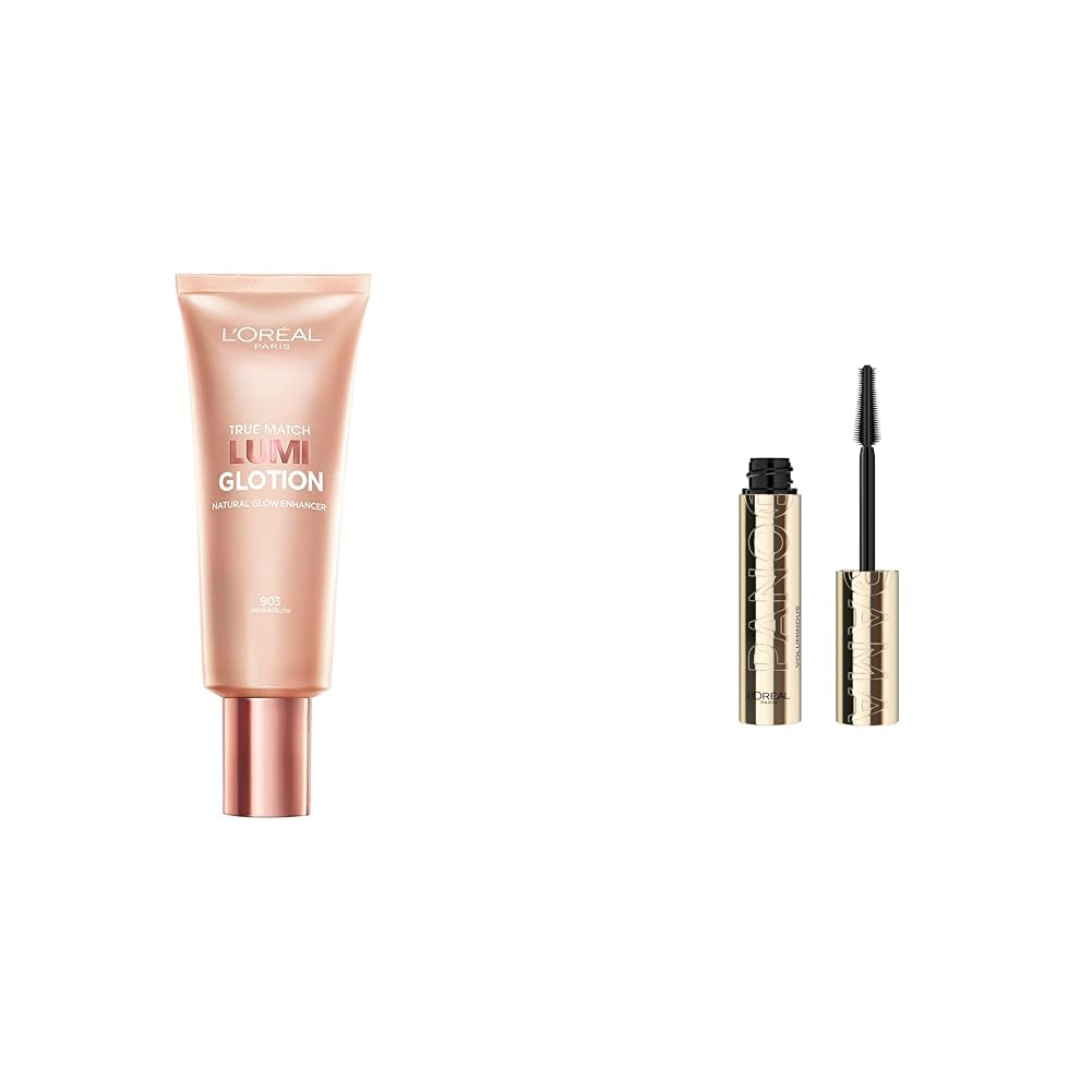 L'Oréal Paris True Match Lumi Glotion Natural Glow Enhancer, Instantly Hydrates and Illuminates Skin, Sheer Color Tint, Offers a Sunkissed Glow, 903 Medium, 40 mL Available in 4 shades for all skintones, True Match LUMI glow lotion can be worn alone, under foundation, or target areas for a more luminous effect. For all over glow: apply under foundation. L'Oréal Paris Voluminous Panorama Mascara, Volumizing and Lengthening Mascara, Washable Longwear and Smudge Resistant Make Up, Blackest Black, 0.33 Fl Oz Are you ready to see life in Panorama? Discover the L'Oréal Paris Voluminous Panorama Mascara which provides corner-to-corner, panoramic volume. Lashes are so fanned out, making your eyes look bigger. Panorama Mascara is suitable for sensitive eyes and is infused with a 5 exclusive stretchflex complex. This ultra-flexible formula extends each lash up and out, volumizing lashes for up to 24H wear. Its multi-level bristle brush contains short long bristles to grab each lash from inner to outer corner and provides a precise application. This volumizing mascara is smudge proof, clump-free and flake resistant.Product 2: MULTI-LEVEL PANORAMIC BRUSH: The multi-level bristle brush catches every lash from inner to outer corner providing an even application from root to tip. Product 2: VOLUMIZING MASCARA: Panorama Mascara provides corner-to-corner, panoramic volume with lashes that are so fanned out, providing up to 1.4x bigger-looking eyes. Product 1: True Match Lumi Glotion's formula is lightweight, blendable, and available in 4 shades to suit different skin tones. Infused with shea butter and glycerin, it keeps your skin hydrated throughout the day, ensuring a flawless, natural glow. Product 1: How to Apply: Apply alone or under makeup. Use lighter shade to illuminate all-over to highlight on high points. Use darker shade to bronze all-over to contour below cheekbones. Product 1: This glow enhancing lotion provides a luminous complexion, leaving your skin looking fresh with a natural sunkissed glow. Can be used on face and body. Product 1: L'Oreal Paris True Match Lumi Glotion is a multi-purpose beauty product that can be used alone, as a primer, under foundation, or to highlight and contour. It hydrates skin and delivers a natural, all-over glow to your skin.