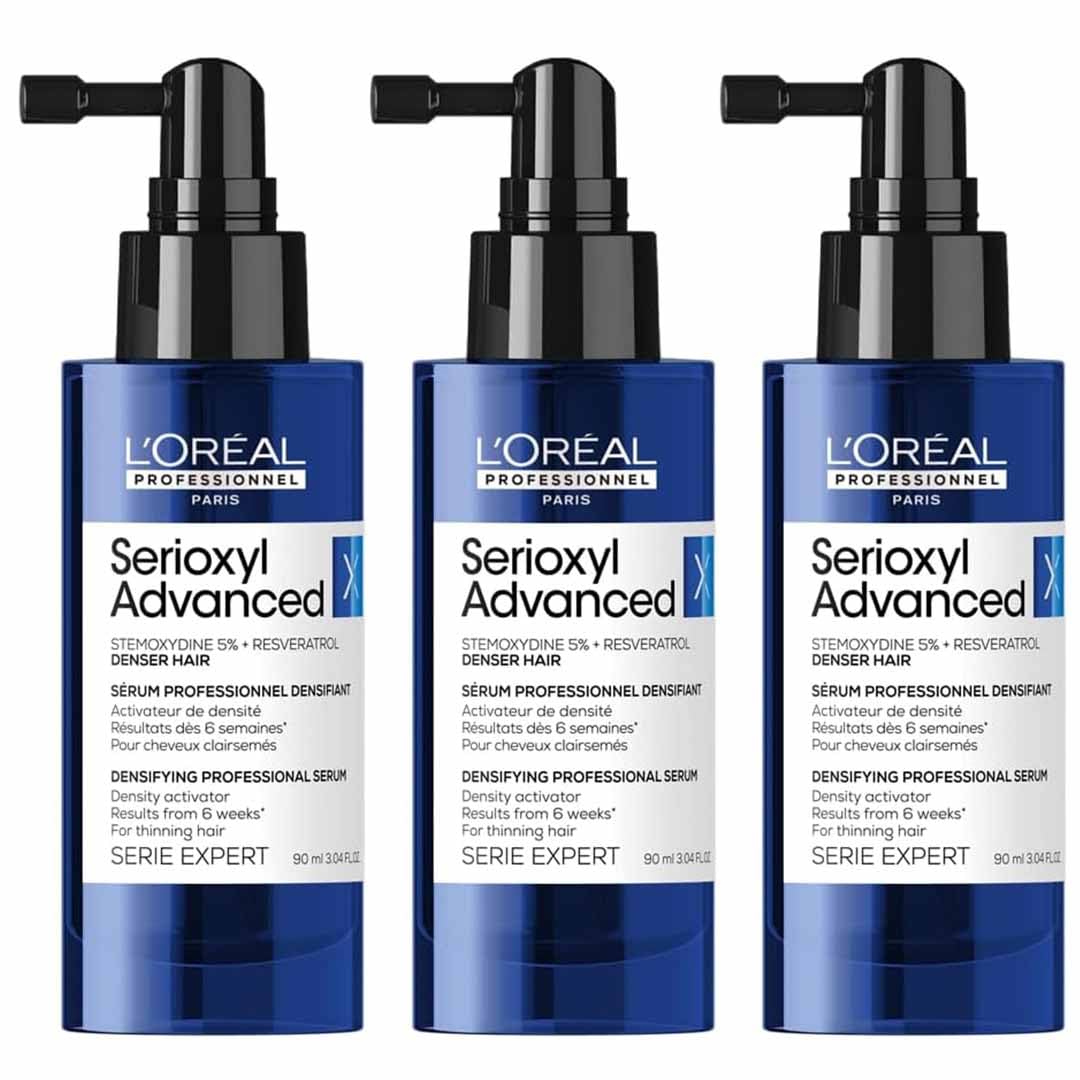 Discover L'Oréal Professionnel's Serioxyl Advanced Professional Densifying Serum, an innovative solution for thinning hair. Enriched with 5 Stemoxydine and Resveratrol, this serum acts as a hair density activator. Its exclusive professional formula promises visible results in just 6 weeks of use. Presented in a convenient 90ml pump bottle, this serum is easy to apply to the scalp. L'Oréal Professionnel's advanced technology offers an effective solution for achieving thicker, fuller hair. Ideal for those experiencing hair thinning, this serum integrates perfectly into your daily hair care routine. The pack contains three 90ml bottles, ensuring several months of use for optimal results. SAFETY WARNING Flammable: Use away from flames, sparks, ignition sources, or incandescent materials. Avoid spraying on irritated skin or towards the eyes in case of contact, rinse them immediately and thoroughly with water.