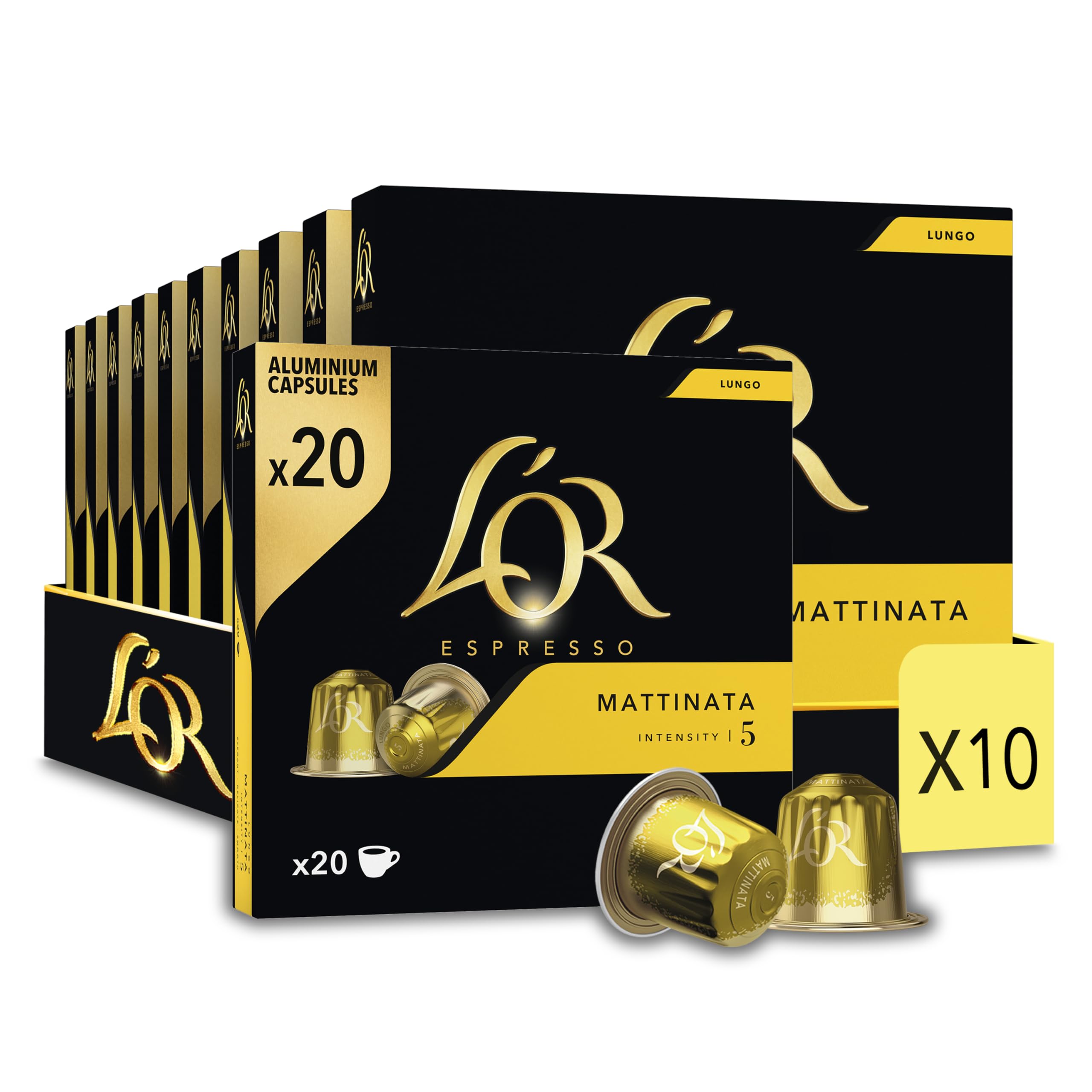 L'OR - Café Espresso - Lungo Mattinata - Intensité 5 - Saveurs Chocolat et Agrumes - 10 lots de 20 capsules aluminium
