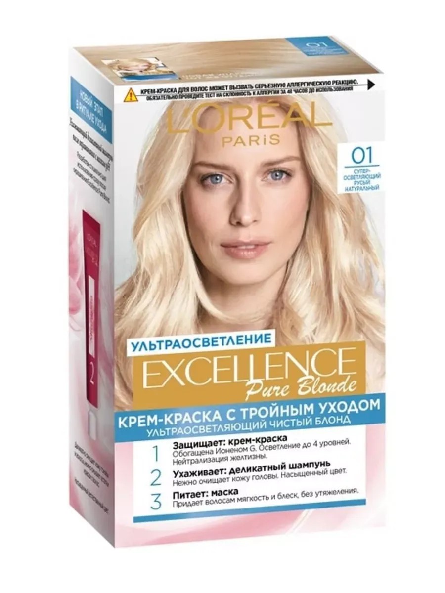 L'Oreal Крем-краска для волос Excellence Pure Blonde тон 01 Суперосветляющий русый натуральный. Инновационная крем-краска Excellence от LOréal Paris с тройной защитой волос на всех этапах окрашивания. Защищает, уплотняет, укрепляет. Локоны приобретают насыщенный живой цвет, который длительное время не смывается и не тускнеет.