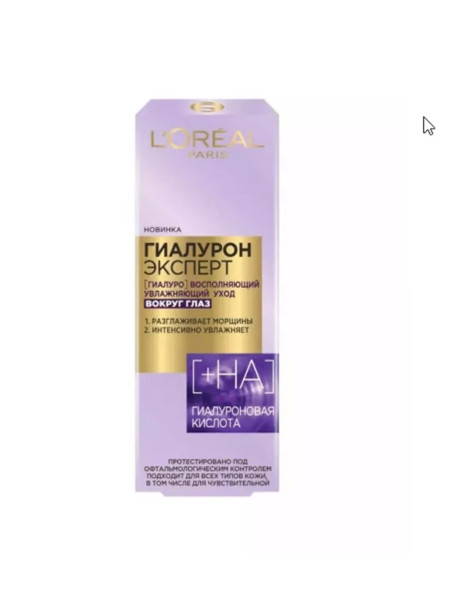 Loreal Hyaluron Expert Eye Cream with Hyaluronic Acid, 15 ml, 1 pc. High-molecular hyaluronic acid promotes hydration and helps smooth the skin's surface. Low-molecular hyaluronic acid helps replenish moisture in the skin, penetrating the epidermal layers. As a result, the skin is replenished with moisture, and wrinkles are smoothed. Suitable for all skin types, including sensitive skin.