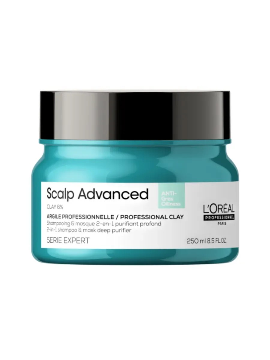 Глубоко очищающий шампунь-маска 2-в-1 L'Oreal Professionnel Serie Expert Scalp Advanced для кожи головы, склонной к жирности. Универсальный продукт Scalp Advanced может быть использован как шампунь, а так же как маска, в качестве глубоко очищающей от остатков загрязнений, пота и выделений сальных желез маски. При использовании в качестве маски абсорбирует излишки кожного сала. Обогащен 6% глиной и ниацинамидом. Обеспечивает чувство легкости и объема. Уже после первого применения на 78% меньше кожного жира и на 24 часа больше объема волос. Не содержит силикона и спирта.