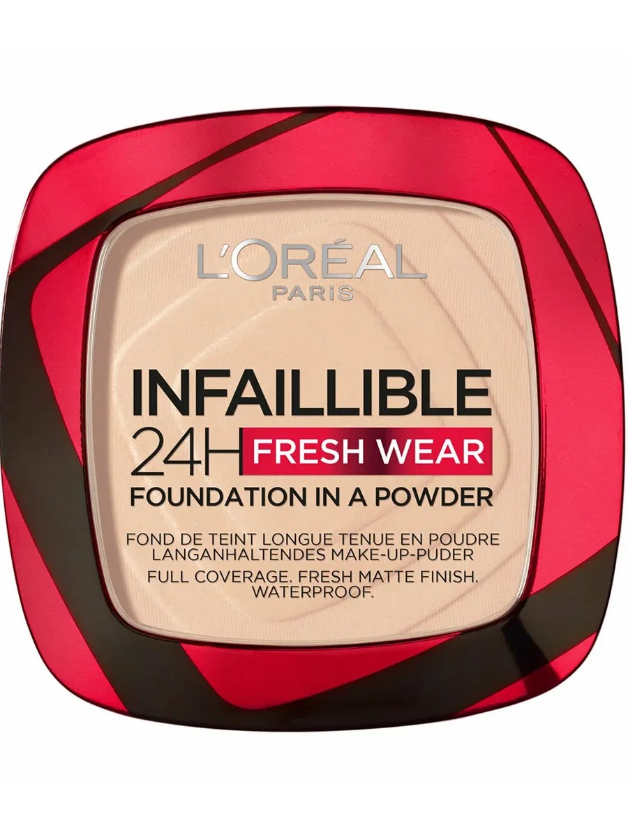 The new generation L'Oreal Paris INFAILLIBLE 24H FRESH WEAR powder combines the best of both worlds: the coverage and durability of foundation and the natural matte finish of powder. Visibly evens skin tone and texture. Long-lasting matte finish for 24 hours.