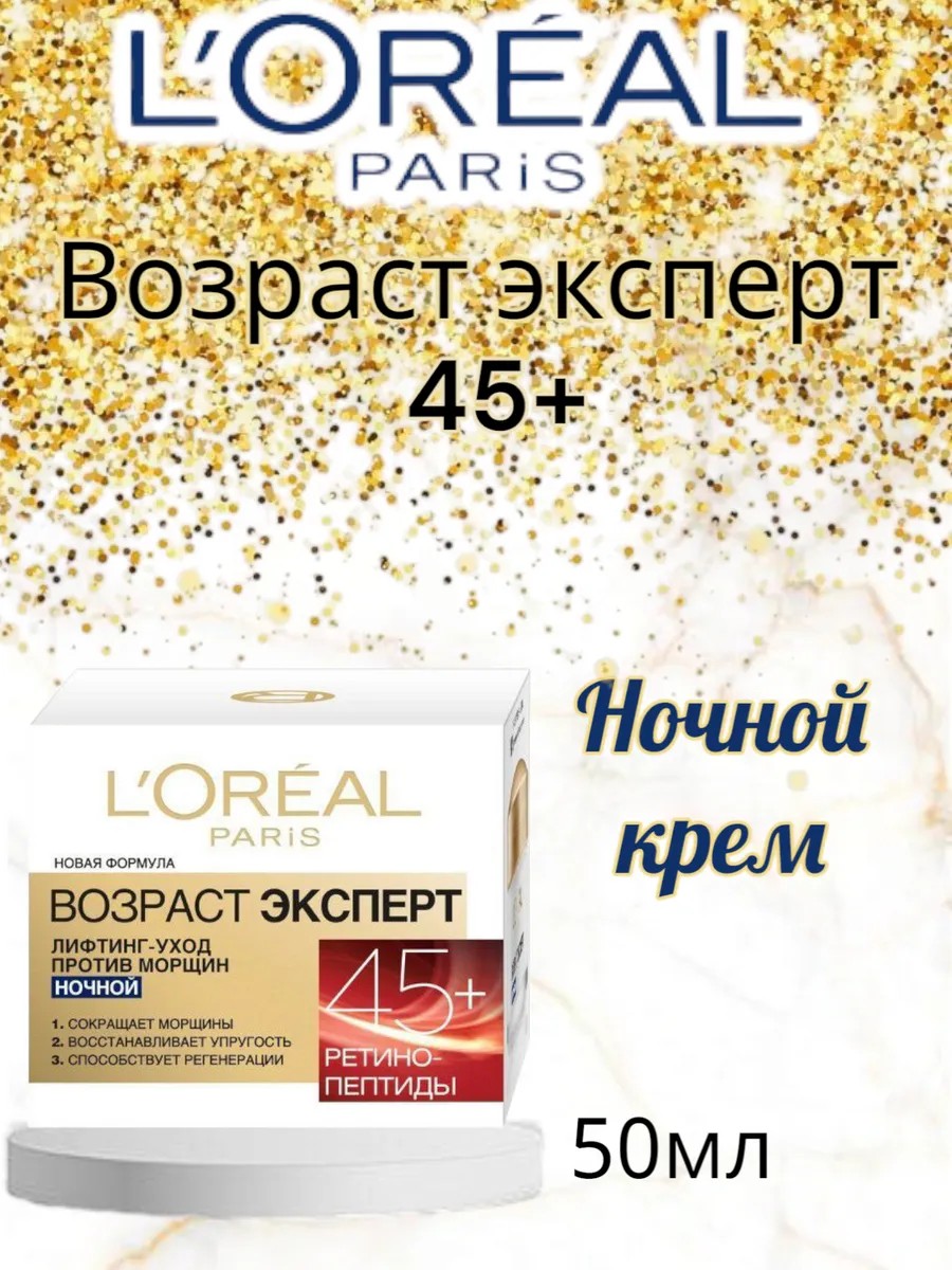 Ночной крем для лица Возраст эксперт 45+ - лифтинг-уход против морщин от L'Oreal Paris (Лореаль Париж) создан специально для ухода за кожей после 45 лет и визуально устраняет возрастные признаки. Про-ретинол стимулирует обновление клеток кожи, способствуя улучшению текстуры кожи. Масло камелии способствует интенсивному питанию и мягкости кожи.