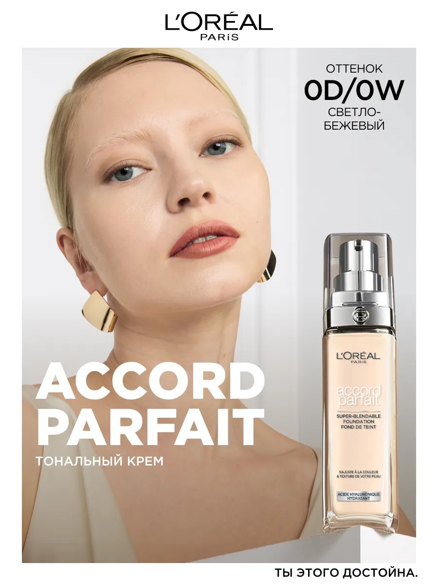 Tональный крем Accord Parfait от L'Oreal Paris выравнивает тон, подстраивается к цвету и текстуре кожи. Заметно преображает кожу за 2 недели применения: кожа более гладкая и сияющая. Ультра-тонкие пигменты подстраиваются под тон и подтон кожи. Формула на 80%, состоящая из увлажняющего крема с гиалуроновой кислотой. 24 часа увлажнения вашей кожи. Естественный финиш, сияющая кожа. SPF 17.