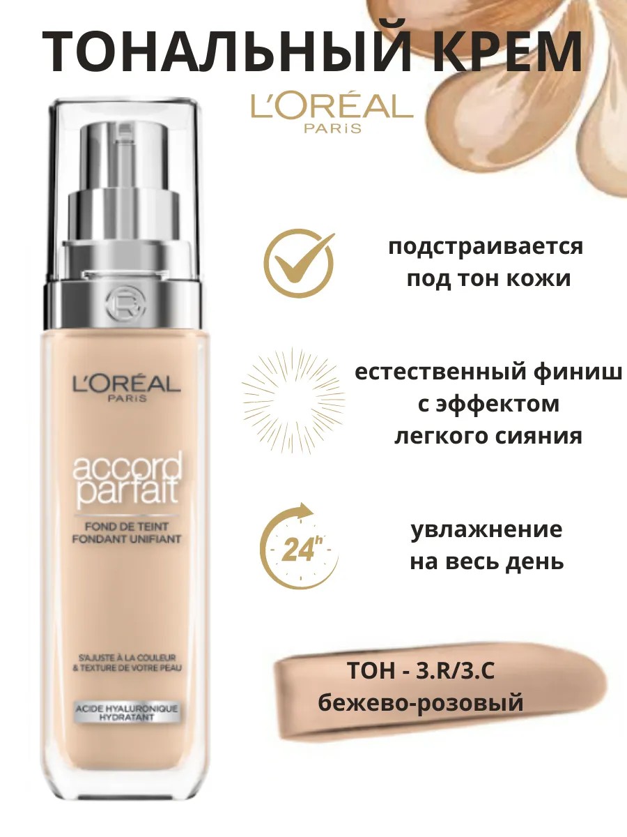 Жидкий тональный крем Accord parfait от L'Oreal Paris (Лореаль Париж) выравнивает тон, подстраивается к цвету и текстуре кожи. Заметно преображает кожу за 2 недели применения: кожа более гладкая и сияющая. Ультра-тонкие пигменты подстраиваются под тон и подтон кожи. Формула на 80%, состоящая из увлажняющего крема с гиалуроновой кислотой. 24 часа увлажнения вашей кожи. Естественный финиш, сияющая кожа. SPF 16.