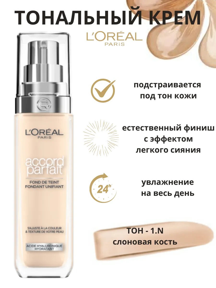 Жидкий тональный крем Accord parfait - Аккорд парфайт от L'Oreal Paris (Лореаль Париж) выравнивает тон, подстраивается к цвету и текстуре кожи. Заметно преображает кожу за 2 недели применения: кожа более гладкая и сияющая. Ультра-тонкие пигменты подстраиваются под тон и подтон кожи. Формула на 80%, состоящая из увлажняющего крема с гиалуроновой кислотой. 24 часа увлажнения вашей кожи. Естественный финиш, сияющая кожа. SPF 16.