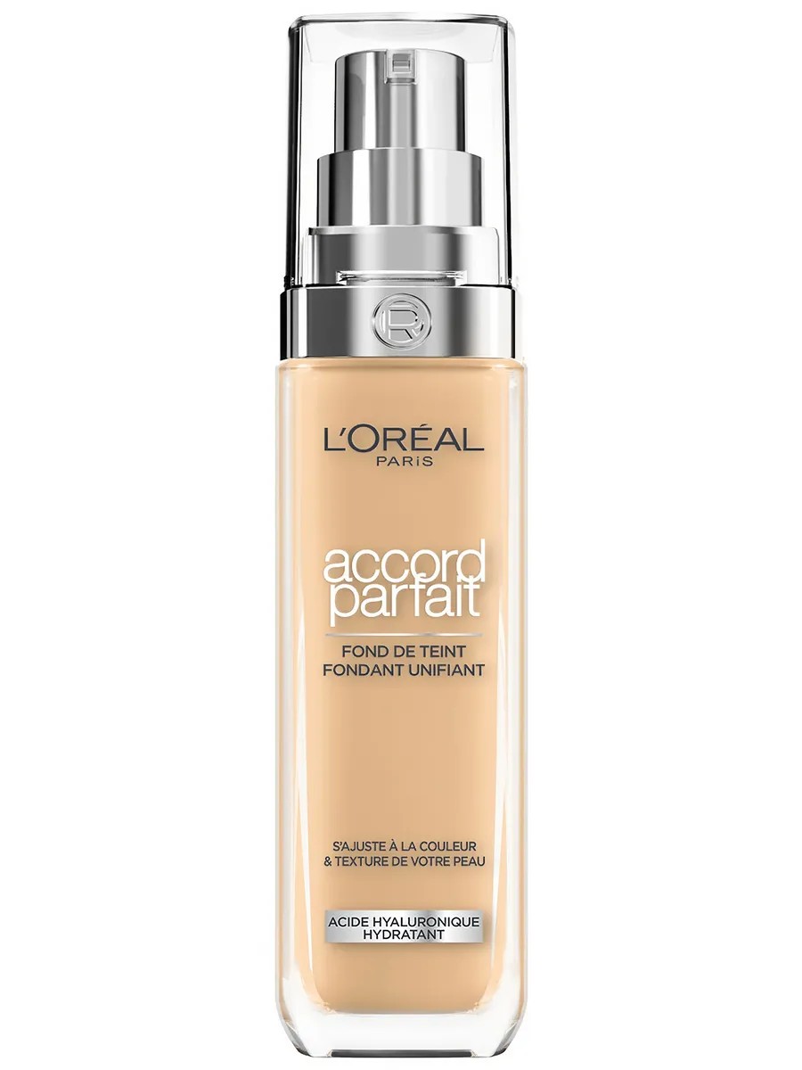 L'Oreal Paris Accord Parfait Foundation, 4D/4W, 30 ml. Accord Parfait liquid foundation from L'Oreal Paris evens out skin tone and adapts to skin color and texture. Visibly transforms skin in 2 weeks of use: skin is smoother and more radiant. Ultra-fine pigments adapt to skin tone and undertone. The formula is 80% moisturizing cream with hyaluronic acid. 24 hours of hydration for your skin. Natural finish, radiant skin. SPF 16. How to choose a shade: the number indicates the intensity of the tone: from the lightest 0.5 to the darkest 4. The letter indicates the undertone: N - for a neutral undertone, R/C - for a cool pink undertone, D/W for a warm golden undertone. SPF 16 Directions: Apply the cream with your fingertips using light strokes over the entire face. For a more lasting result, we recommend setting the foundation with Accord Parfait powder. For targeted correction of imperfections, use with ALLIANCE PERFECT THE ONE or TRUE MATCH concealer. Ingredients: AQUA/WATER, DIMETHICONE, ISODODECANE, CYCLOHEXASILOXANE, GLYCERIN, PEG-10 DIMETHICONE, METHYL METHACRYLATE CROSSPOLYMER, BUTYLENE GLYCOL, PENTYLENE GLYCOL, SYNTHETIC FLUORPHLOGOPITE, DISTEARDIMONIUM HECTORITE, HYDROXYETHYLPIPERAZINE ETHANE SULFONIC ACID, CETYL PEG/PPG-10/1 DIMETHICONE, SODIUM CHLORIDE, POLYGLYCERYL-4 ISOSTEARATE, HEXYL LAURATE, CAPRYLYL GLYCOL, PHENOXYETHANOL, DISODIUM STEAROYL GLUTAMATE, TOCOPHEROL, PANTHENOL, ALUMINUM HYDROXIDE, HYDROXYETHYL UREA, HYDRATED SILICA, METHICONE, [+/- MAY CONTAIN: CI 77891/TITANIUM DIOXIDE, CI 77491, CI 77492, CI 77499/IRON OXIDES, MICA, CI 15985/YELLOW 6 LAKE, CI 42090/BLUE 1 LAKE, CI 77510/FERRIC AMMONIUM FERROCYANIDE, CI 45410/RED 28 LAKE, CI 15850/RED 7].