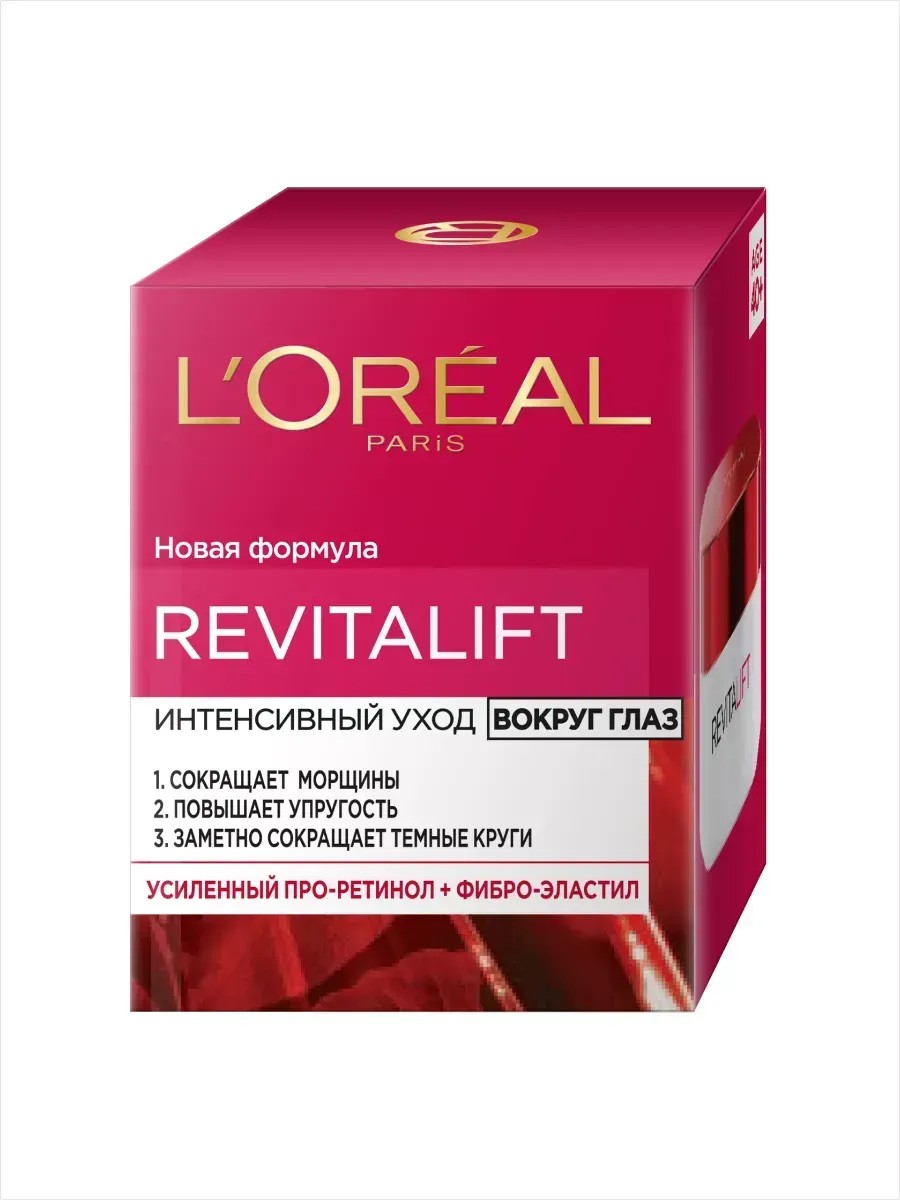 Антивозрастной крем вокруг глаз Revitalift (Ревиталифт) - легендарный уход от L'Oreal Paris (Лореаль Париж). Он обладает тройным ремоделирующим эффектом: заметно сокращает морщины, повышает упругость кожи и борется с тёмными кругами, мешками под глазами. Уникальная технология cтимулифт, входящая в формулу "Revitalift" направлена на стимуляцию восьми природных лифтеров в слоях кожи. Также в состав входит Про-Ретинол А, разглаживающий морщины. Как результат - кожа выглядит более упругой и увлажнённой, сокращаются морщины, исчезают тёмные круги под глазами. Увлажняет кожу. Замедляет процесс появления новых морщин.