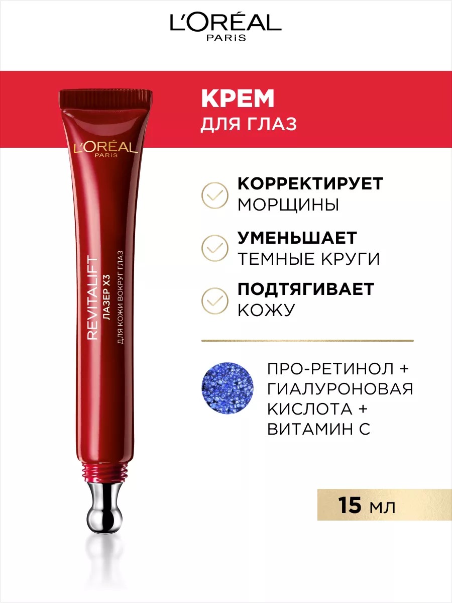 Revitalift Лазер х3 крем для кожи вокруг глаз, обогащенный гиалуроновой кислотой и про-ретинолом, сокращает мимические морщины, осветляет темные круги под глазами, делает кожу более упругой и подтянутой, устраняет отечность и мешки.