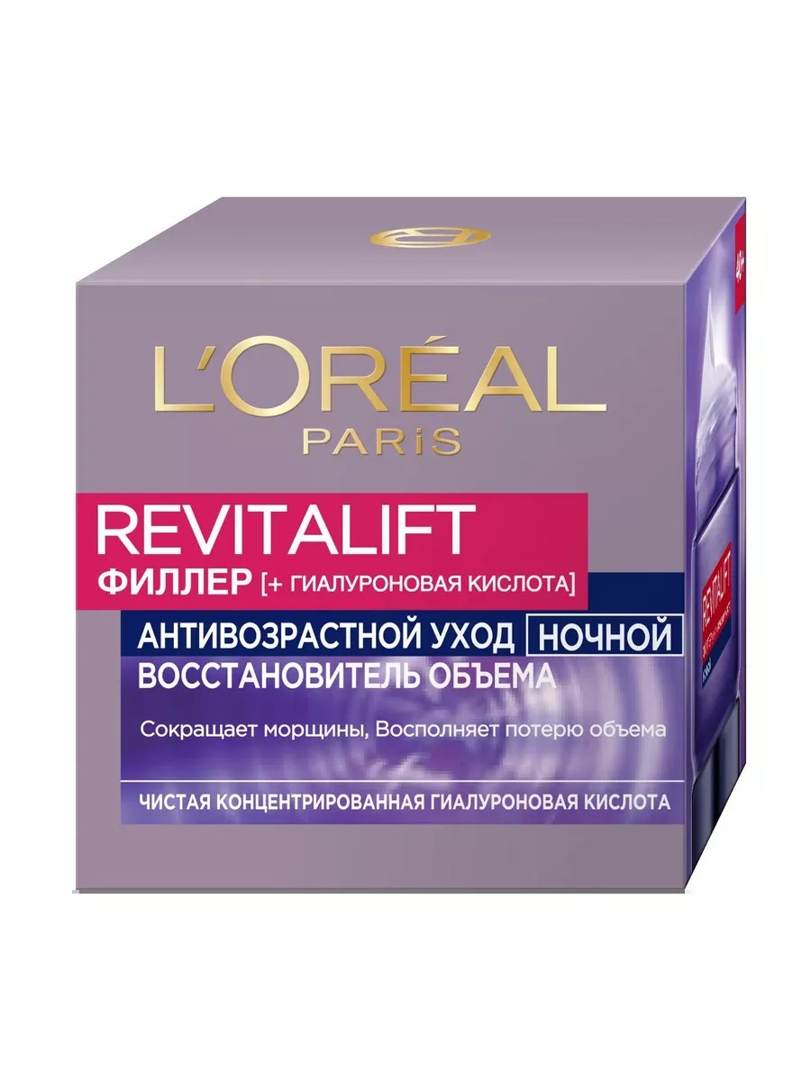 Антивозрастной крем Филлер для лица ночной, 50 мл . Антивозрастной филлер для лица ночной от Лореаль Париж обогащен высококонцентрированной гилауроновой кислотой, что делает его супер эффективным средством для борьбы с возрастными изменениями. Он работает в ночное время, когда процессы регенерации клеток особенно активны, стимулирует выработку коллагена, повышает эластичность и упругость кожи. Гилауроновая кислота в составе проникает в глубокие слои дермы, наполняет ее изнутри, "выталкивает" морщины, придает объем и упругость коже. Растительный экстракт Галанги уменьшает следы усталости, придает коже сияние и свежесть.