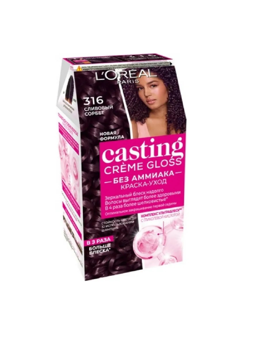 L'Oreal Paris, Краска-уход для волос Casting Creme Gloss 316 Сливовый сорбет, 254мл. Окрашивание волос превращается в настоящую процедуру ухода, сравнимую с оздоровлением в салоне красоты. Уникальный состав краски во время окрашивания защищает структуру волос от повреждения, одновременно ухаживая и разглаживая их по всей длине. Сохранить и усилить эффект шелковых блестящих волос после окрашивания позволит использование Нового бальзама для волос с Маслом Кокоса, который придает Вашим волосам мягкость, блеск и шелковистость.