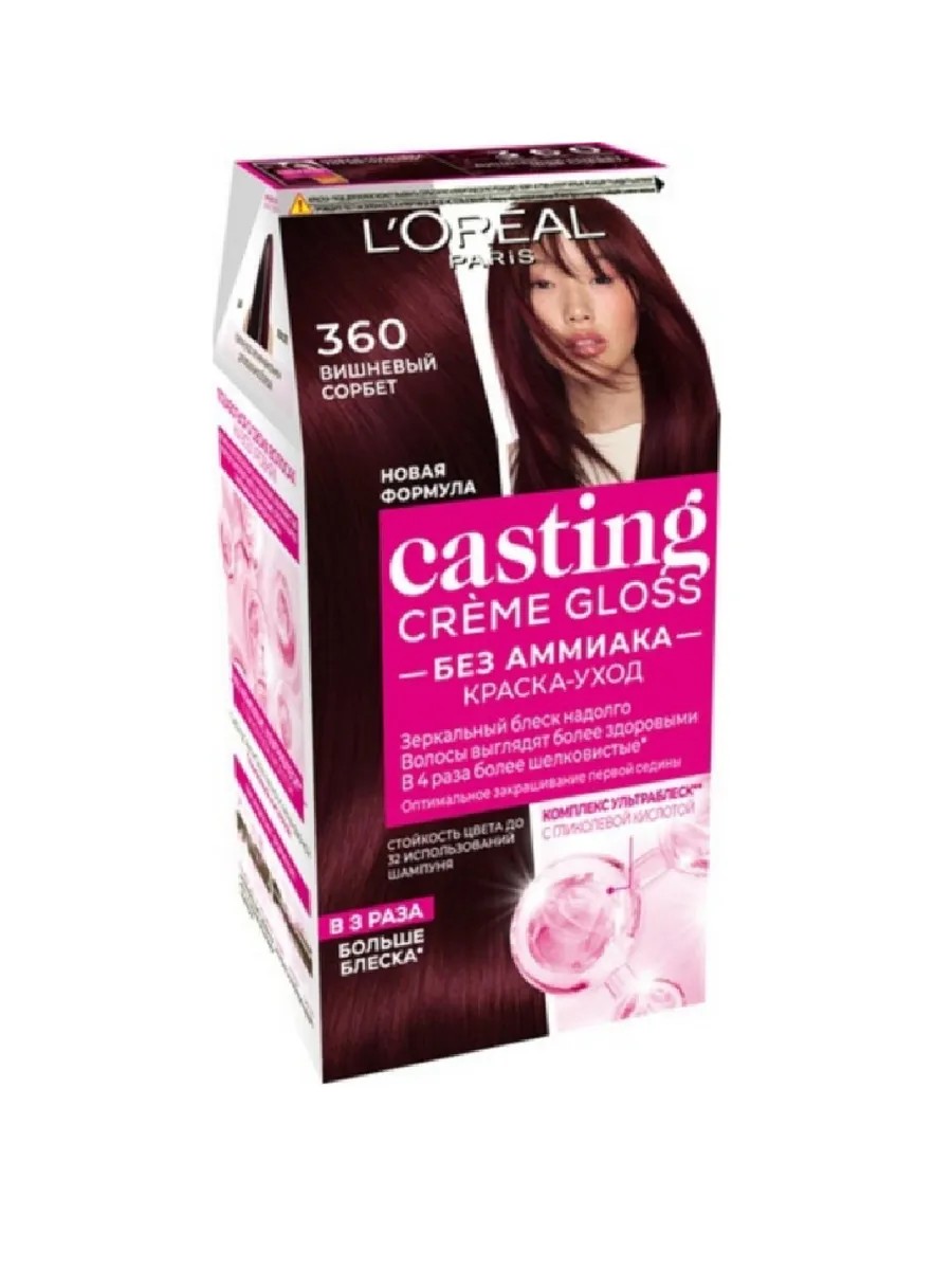 L'Oreal Paris, Краска-уход для волос Casting Creme Gloss 360 Вишневый сорбет, 254мл. Окрашивание волос превращается в настоящую процедуру ухода, сравнимую с оздоровлением в салоне красоты. Уникальный состав краски во время окрашивания защищает структуру волос от повреждения, одновременно ухаживая и разглаживая их по всей длине. Сохранить и усилить эффект шелковых блестящих волос после окрашивания позволит использование Нового бальзама для волос с Маслом Кокоса, который придает Вашим волосам мягкость, блеск и шелковистость.