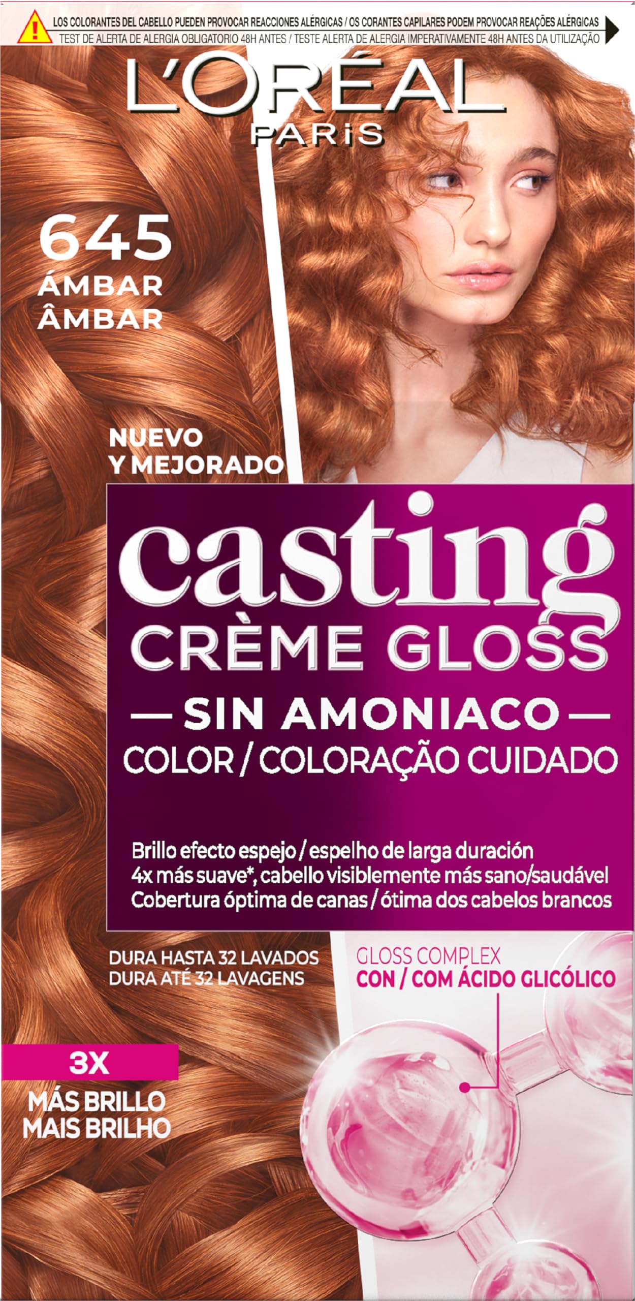 Casting Creme Gloss N 645 — a hygienic and healthy product with visible results from the first use. Perfect for home and travel, and distinguished by its premium design. INGREDIENTS Colorant DIRECTIONS Apply the product evenly to dry, smooth hair. See more
