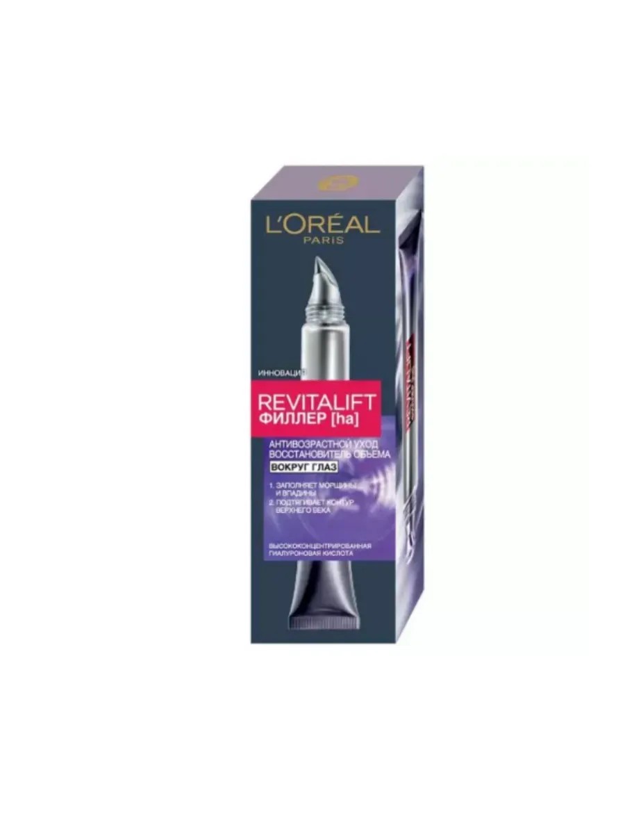 L'Oreal Крем вокруг глаз Revitalift Филлер Антивозрастной, 15 мл. Revitalift Филлер + Гиалуроновая кислота - это антивозрастной уход восстановитель объема в зоне вокруг глаз. Инновационная формула с чистой концентрированной гиалуроновой кислотой заполняет морщины и подтягивает контуры верхнего века. Антивозрастной крем для области вокруг глаз Revitalift Филлер оказывает выраженное воздействие на нежную тонкую кожу в этой зоне. Его инновационная формула обогащена чистой концентрированной гиалуроновой кислотой, удерживающей драгоценную влагу в коже и стимулирующей регенерацию на клеточном уровне. Преимущества: благодаря гиалуроновой кислоте высокой концентрации, проникающей в ткани кожи, формула ухода эффективно заполняет морщины изнутри, сокращает мешки под глазами; подтягивает контур верхнего века: укрепляет кожу верхнего века и словно подтягивает ее. Взгляд становится более распахнутым. Кожа вокруг глаз обновляется день за днем.