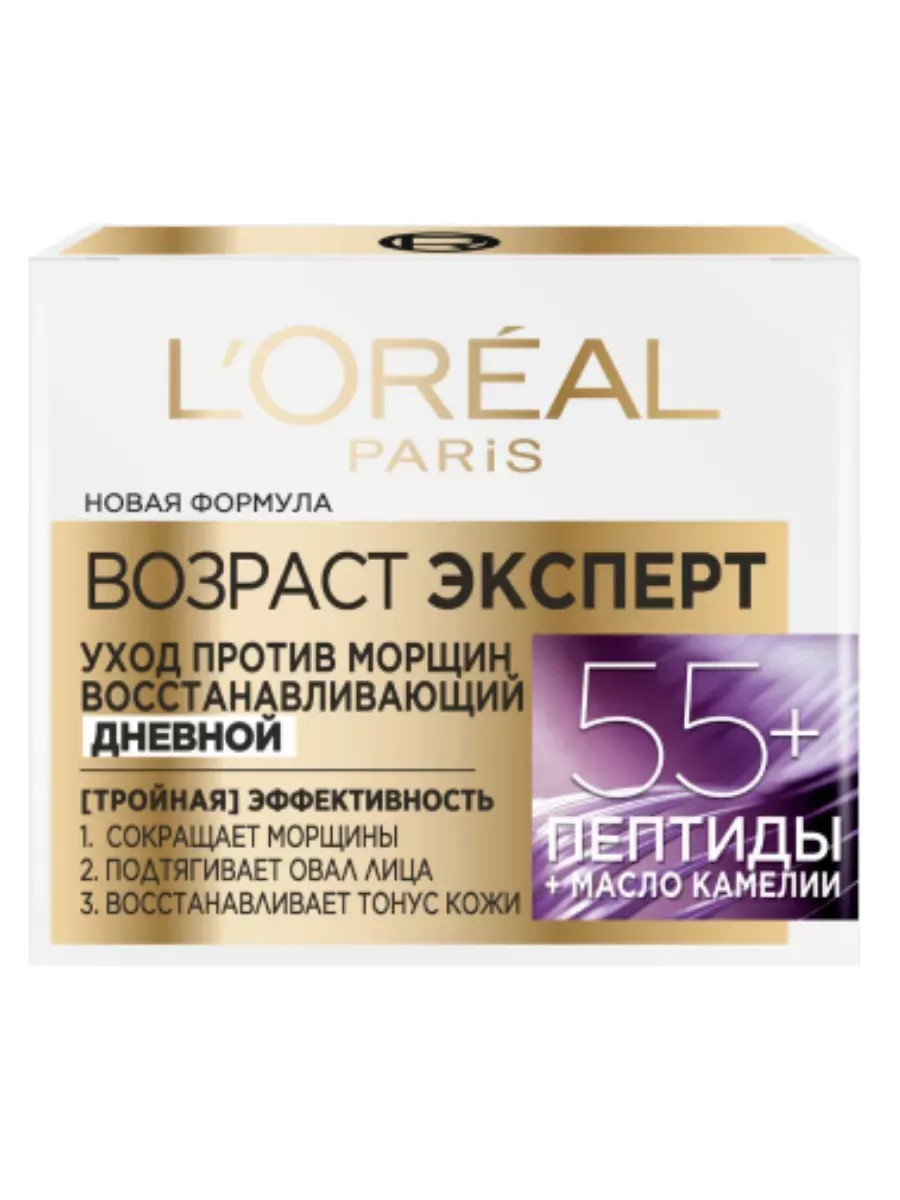 Restorative anti-wrinkle care Age Expert 55+ from L'Oreal Paris is specially designed for skin care after 55 years and visually eliminates the signs of aging. Peptides stimulate elastin production, helping to restore elasticity and strengthen the skin. Camellia oil promotes intensive nourishment and softness of the skin.