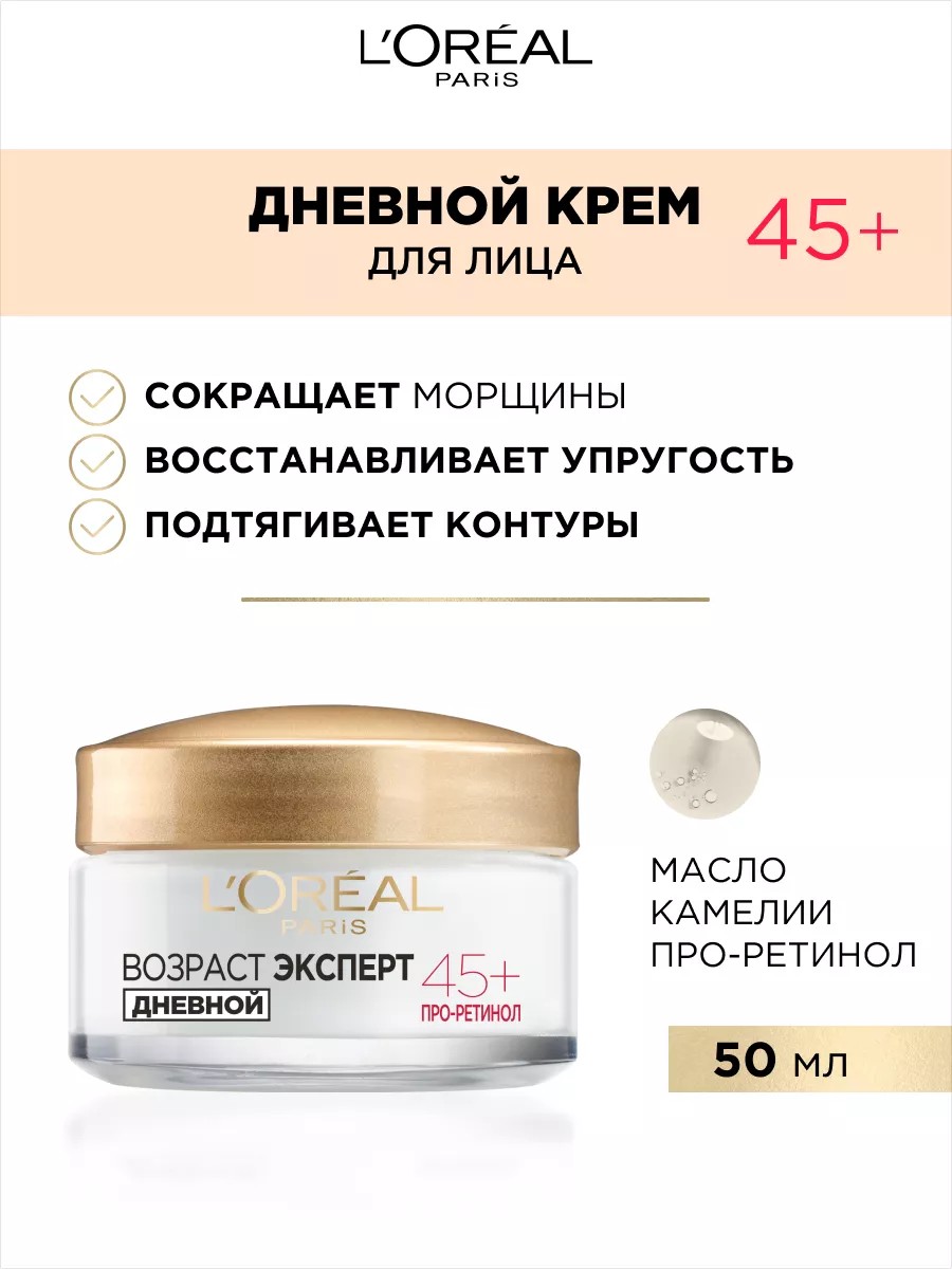 Lifting and anti-wrinkle treatment Age Expert 45+ from L'Oréal Paris is specially designed for skin care after age 45 and visually eliminates the signs of aging. Pro-retinol stimulates skin cell renewal, helping to improve skin texture. Camellia oil promotes intensive nourishment and softness of the skin. HOW TO USE: Apply the cream every morning to a cleansed face and neck, avoiding the eye area. For better absorption, massage in with circular motions. Reduces wrinkles. Restores elasticity. Tightens contours.