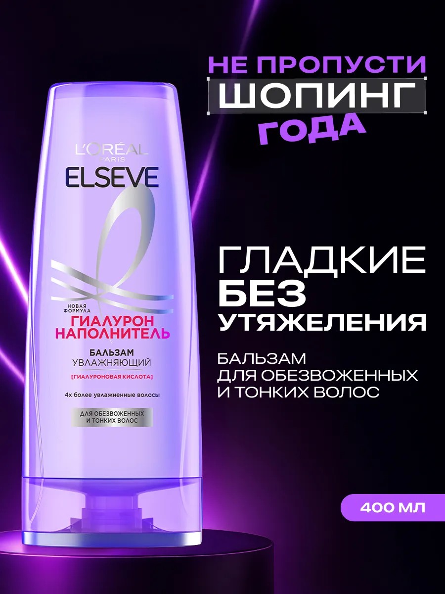 У Вас обезвоженные и тонкие волосы? Подарите своим волосам интенсивное увлажнение и легкое расчесывание! ELSEVE [Гиалурон] Наполнитель от L'Oreal Paris мгновенно преображает обезвоженные волосы, наполняя влагой, делает их блестящими, объемными и упругими без утяжеления. Увлажняющий бальзам Эльсев заметно облегчает расчесывание, интенсивно увлажняет на 72 часа, при совместном применении с шампунем придает объем. Волосы в 10 раз более увлажненные. 24 часа упругости. Волосы выглядят более объемными после совместного применения шампуня и бальзама.