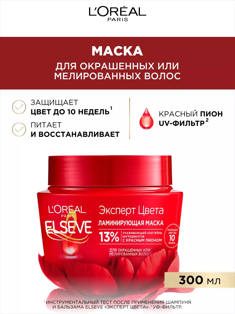 В пять раз больше сияния с маской для окрашенных и мелированных волос ELSEVE (ЭЛЬСЕВ), Эксперт цвета от L'OREAL PARIS (ЛОРЕАЛЬ ПАРИЖ)! Специально разработанная лабораторией бренда формула интенсивно действует в нескольких направлениях: маска для волос защищает и продлевает цвет, защищает окрашенные волосы до 10 недель, благодаря эффективной формуле с UV-фильтром и продлевает блеск.