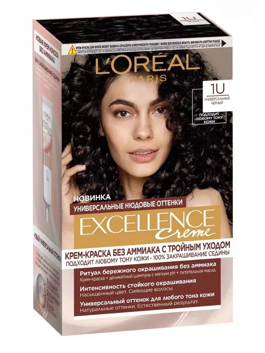 L'Oreal Paris Excellence Nudes Ammonia-Free Hair Color, Shade 1U Universal Black, 1 Count. Natural nude shades - Excellence Creme, an ammonia-free cream hair color with triple care. This is the first ammonia-free cream color that provides 100% gray coverage and triple care: for color, scalp, and hair. This color is based on the innovative Universal Reflect, a unique combination of cool and warm shades that creates a natural, multidimensional color. Before coloring, remove jewelry and apply a care cream along the contours of the face to protect the skin from the color. Before use, perform an allergy test. Read the instructions carefully. 1. This ammonia-free cream color protects hair during coloring, enriched with pro-keratin and a protective serum. 2. A nourishing post-color shampoo with a mild pH gently cleanses the scalp and hair. 3. A light, nourishing hair mask, enriched with ceramide, makes hair soft and shiny, restores elasticity, and prolongs the life of color.