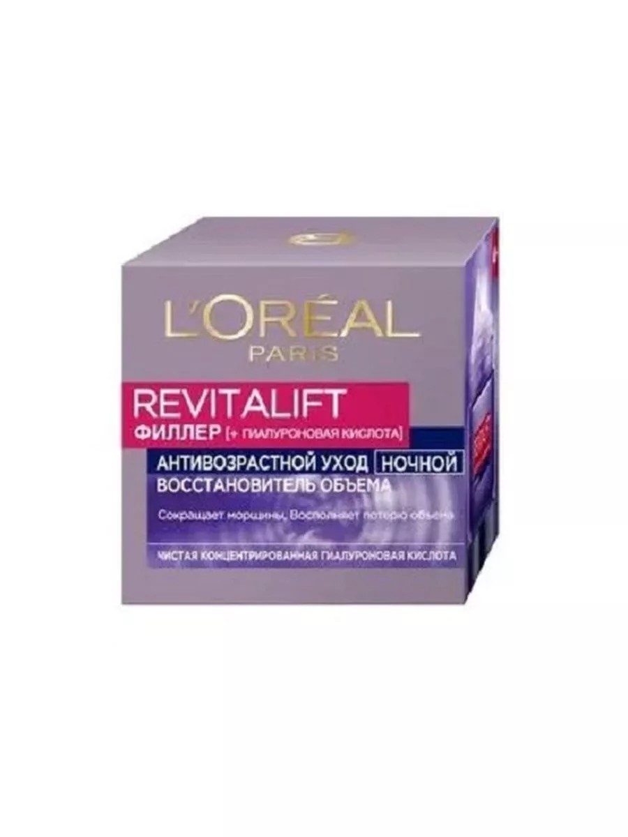 Revitalift Anti-Wrinkle Face Cream 50 ml. The anti-aging night cream "Revitalift Filler" stimulates regeneration processes at the cellular level, accelerates collagen production, and improves skin elasticity and firmness. Galangal plant extract actively restores skin during sleep, reducing signs of fatigue. Its unique formula is enriched with highly concentrated hyaluronic acid, which promotes hydration and moisture retention in the deep layers of the skin. This nighttime facial treatment improves cellular renewal, reduces wrinkles, smoothes skin, and restores lost volume.