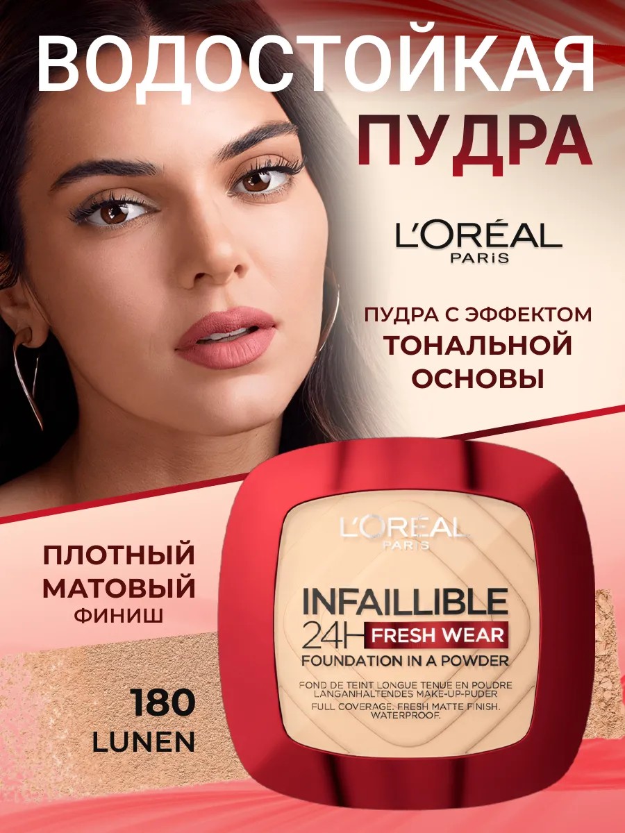 Пудра loreal Infaillible 24h fresh wear - ИНФАИБЛЬ - компактная матирующая пудра нового поколения сочетает в себе лучшее от обеих категорий: покрытие и стойкость, как у тонального крема, и естественный матовый результат пудры. Это косметическое средство jn от L'Oreal Paris обеспечивает ровный тон кожи без жирного блеска и расширенных пор.