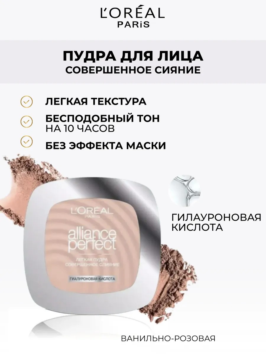 Alliance Perfect Compact Powder from L'Oréal will make your skin flawless. This lightweight powder with hyaluronic acid, ALLIANCE PERFECT, is high-quality cosmetics for real women. It adapts to your skin tone and conceals imperfections. Delicate, radiant, healthy skin with a vanilla-pink hue. With L'Oréal Paris powders, your face always looks flawless. The innovative formulas instantly adapt to your skin tone, smoothing and perfecting the surface without weighing it down. The lightweight textures are non-drying and don't leave a feeling of tightness, reliably concealing shine, and laying down in an even, weightless veil.