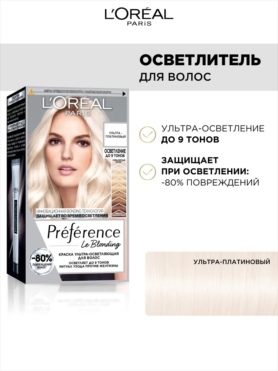 Осветлитель Preference - это осветление до 9 тонов, возможность получить чистый платиновый оттенок блонд после первого использования и укрепление волос до 5 раз. Откройте для себя инновационную осветляющую технологию от Preference. Впервые, формула, которая способна осветлить волосы до 9 оттенков вплоть до чисто платинового, даже темно-каштановый исходный оттенок. Осветлитель Preference содержит новый укрепляющий кондиционер, интенсивно питающий волосы и визуально уменьшающий повреждения. Волосы в 5 раз сильнее. Обогащён фиолетовыми пигментами для нейтрализации желтизны.