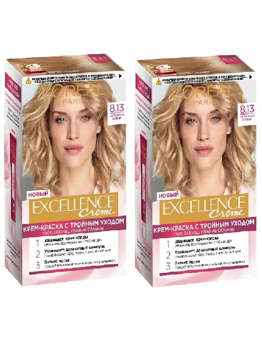 Loreal Paris, Excellence Стойкая крем-краска для волос 8.13 Светло-русый бежевый, 192 мл, 2 штуки. Крем-краска для волос Excellence защищает волосы до, во время и после окрашивания. Уникальная формула краски из Керамида, Про-Кератина и активного компонента Ионена G, которые обеспечивают 100%-ное окрашивание седины и способствуют длительному сохранению интенсивности цвета. Сыворотка, входящая в состав краски, оказывает лечебное действие, восстанавливая поврежденные волосы, а густая кремовая текстура краски обволакивает каждый волос, насыщая его интенсивным цветом. Специальный бальзам-уход делает волосы плотнее, укрепляет их, восстанавливая естественную эластичность и силу волос.