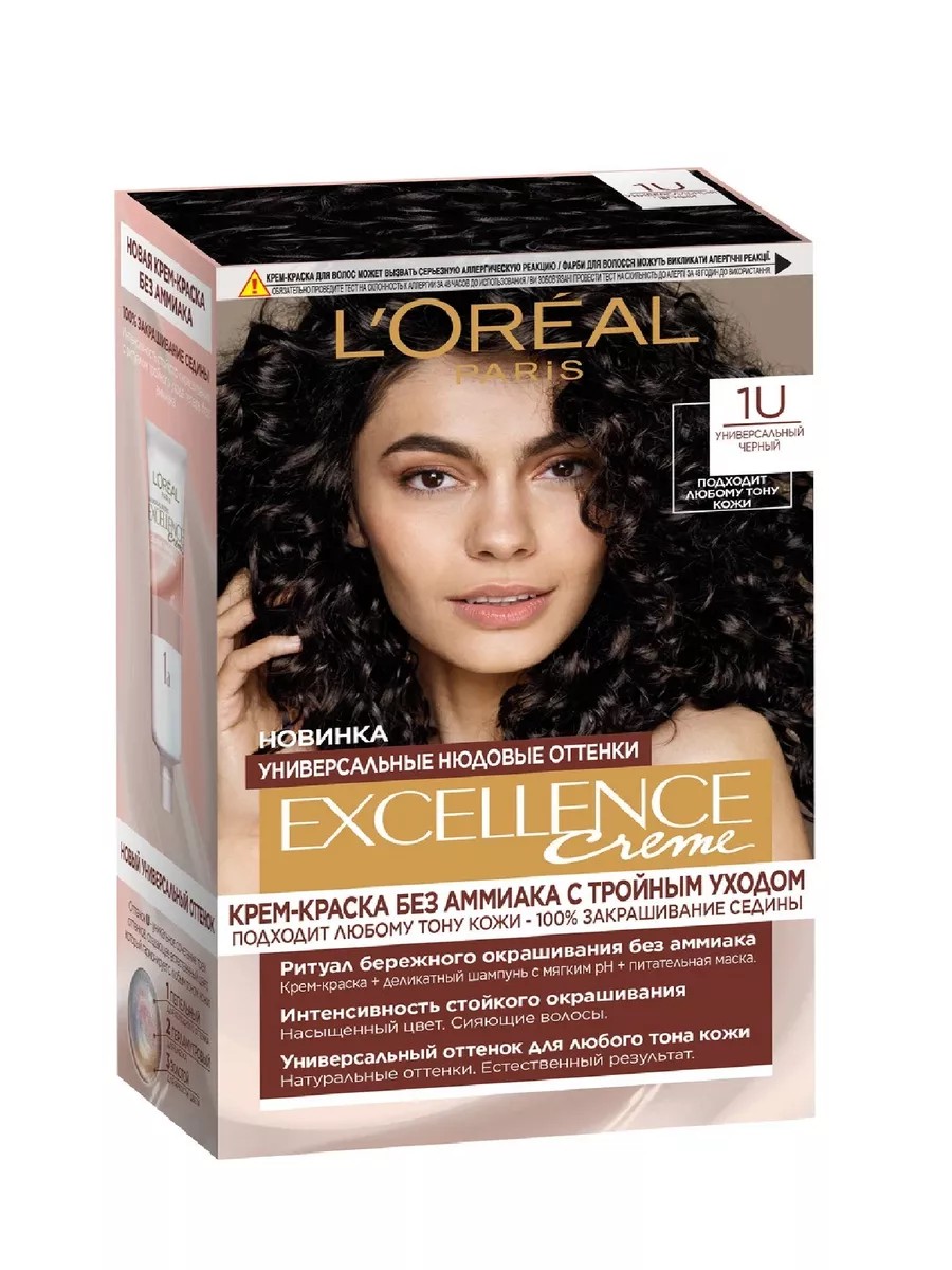 Universal nude shades - Excellence Crème, ammonia-free cream hair color with triple care. Excellence by L'Oréal Paris presents the first line of universal nude shades. This color is based on the innovative Universal Reflect – a unique combination of cool and warm shades, creating a natural color that harmonizes with any skin tone. This is the first ammonia-free cream color that provides 100% gray coverage and provides triple care: color, scalp, and hair. Before coloring, remove jewelry and apply cream along the contours of the face to protect the skin from color. Before use, perform an allergy test. Read the instructions carefully. 1. This ammonia-free cream color protects hair during coloring, enriched with pro-keratin and a protective serum. 2. A nourishing post-color shampoo with a mild pH gently cleanses the scalp and hair. 3. A light, nourishing hair mask, enriched with ceramide, makes hair soft and shiny, restores elasticity, and prolongs the life of color.