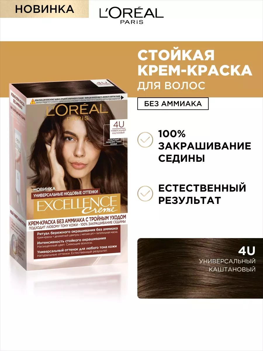 Универсальные нюдовые оттенки - Excellence Crème крем-краска для волос без аммиака с тройным уходом. Excellence от L'Oreal Paris представляет первую линейку универсальных нюдовых оттенков. Краска основана на действии инновационного универсального рефлекта - уникального сочетания холодных и теплых оттенков, создающего естественный цвет, который гармонирует с любым тоном кожи. Это первая крем-краска без аммиака, которая на 100% закрашивает седину и обеспечивает тройной уход: за цветом, за кожей головы, за волосами. Перед окрашиванием необходимо снять украшения и нанести крем по контуру лица для защиты кожи от попадания краски. Перед применением следует пройти тест на аллергическую реакцию. Внимательно прочтите инструкцию. 1. Крем-краска без аммиака защищает волосы во время окрашивания, обогащена про-кератином и защищающей сывороткой. 2. Ухаживающий шампунь после окрашивания с мягким pH деликатно очищает кожу головы и волосы. 3. Легкая питательная маска для волос, обогащенная керамидом, делает волосы мягкими, блестящими, восстанавливает эластичность и продлевает стойкость окрашивания.