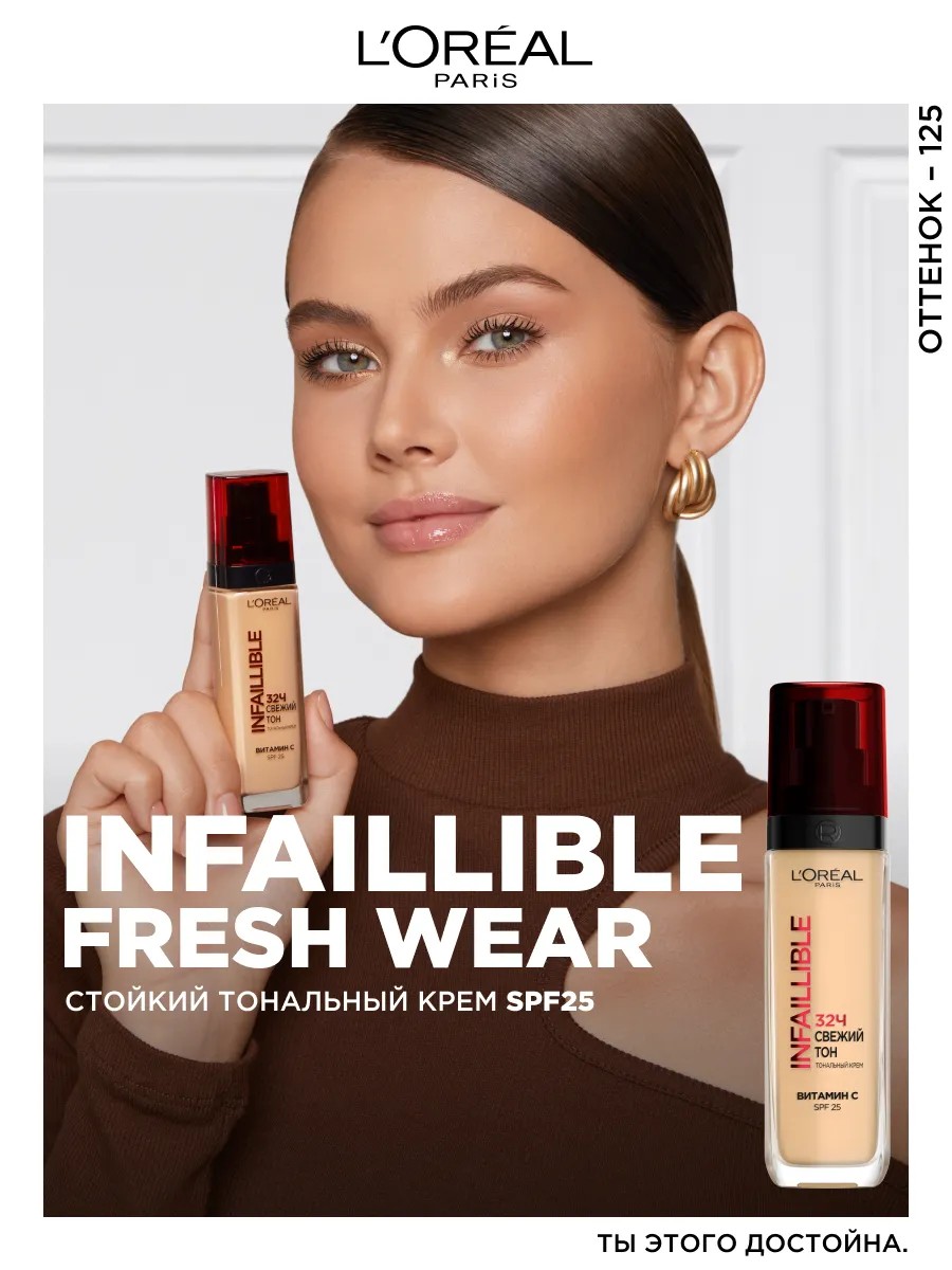 Тональный крем нового поколения INFAILLIBLE 32Ч СВЕЖИЙ ТОН от L'Oreal Paris дает лёгкий устойчивый результат с UV-защитой. Позволяет коже дышать, сохраняя стойкий результат в течение всего дня. Формула с добавлением ухаживающих компонентов: витамин Е и перламутровый пигмент. Больше стойкости, больше ухода. Будь INFAILLIBLE.