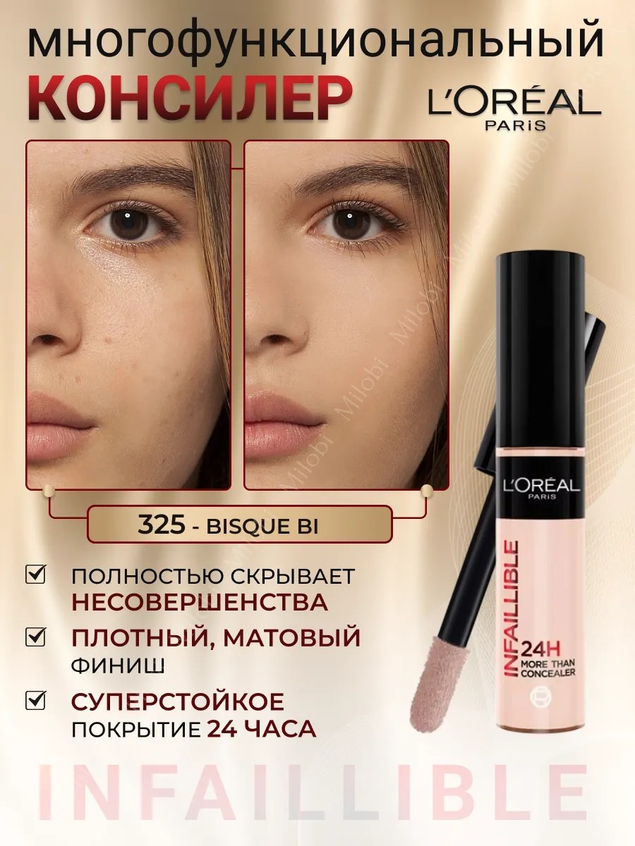 Стойкий многофункциональный консилер loreal INFAILLIBLE - ИНФАИБЛЬ – это больше, чем просто средство косметики для макияжа. Его кремовая текстура обеспечивает высокую степень пигментации, позволяя полностью скрыть несовершенства кожи и создать ровный тон без жирного блеска. Благодаря матовому финишу кожа выглядит естественно и ухоженно. l'oreal paris infaillible 24H more than concealer.