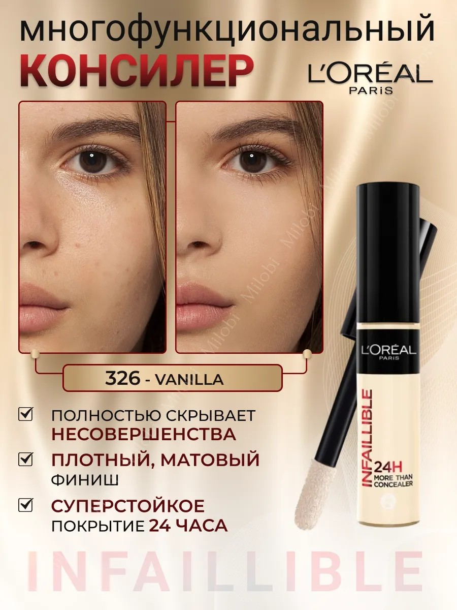 Стойкий многофункциональный консилер loreal INFAILLIBLE - ИНФАИБЛЬ – это больше, чем просто средство косметики для макияжа. Его кремовая текстура обеспечивает высокую степень пигментации, позволяя полностью скрыть несовершенства кожи и создать ровный тон без жирного блеска. Благодаря матовому финишу кожа выглядит естественно и ухоженно. l'oreal paris infaillible 24H more than concealer.