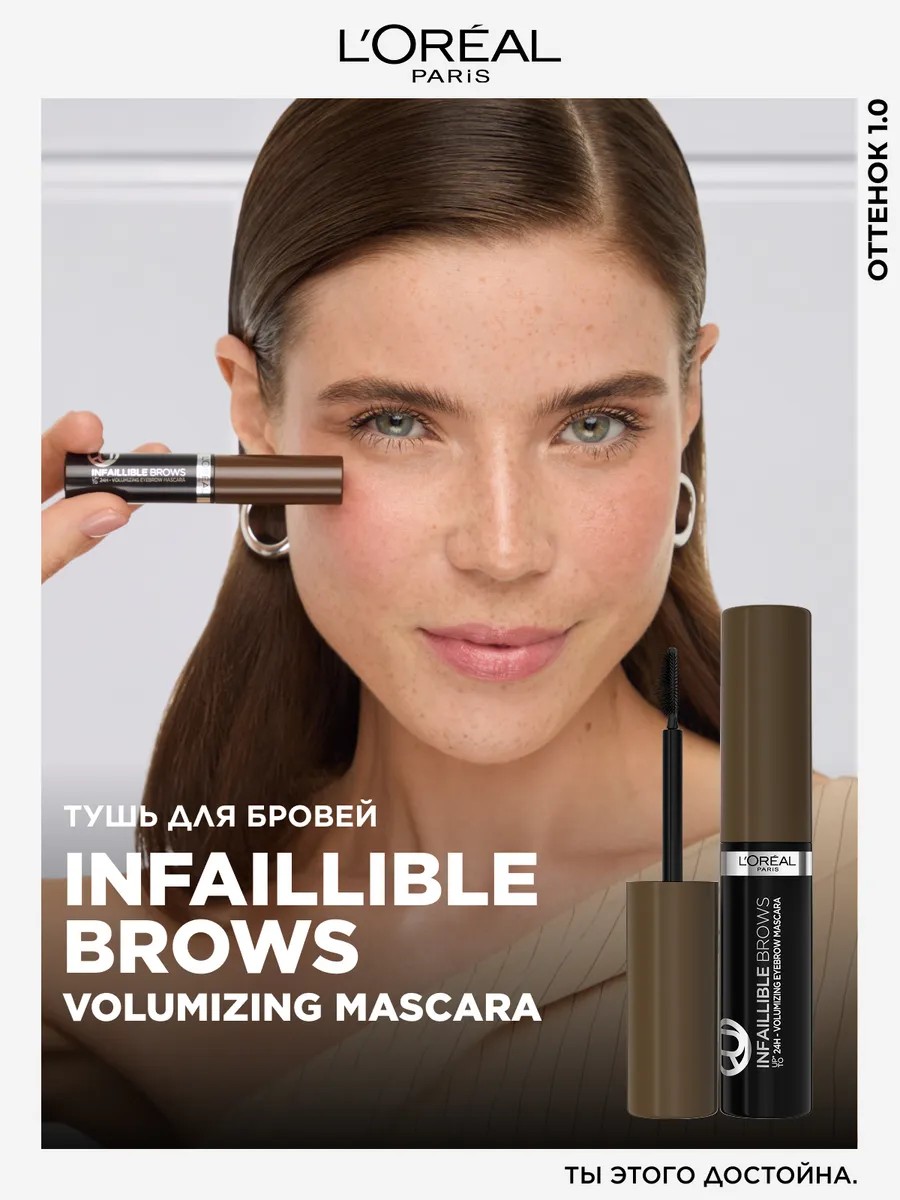 Оттеночная тушь INFAILLIBLE Brows Volumizing Mascara в новой упаковке от L'Oreal Paris отлично подойдет для создания идеальной формы бровей. Удобный, укороченный аппликатор и особая форма фибровой щеточки с тонким кончиком позволяют детально смоделировать форму. Легкая гелевая текстура фиксирует форму, придает натуральный оттенок и объем бровям стойкостью 24 ч.