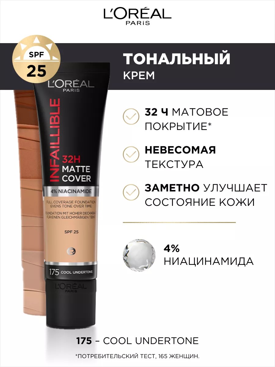 Матирующий cтойкий тональный крем Infaillible Matte Cover [Инфаибль Мат Кавер] 32 часа работает на твою кожу и заметно улучшает ее состояние. Он создает стойкое ровное матовое покрытие, без эффекта маски! Формула с 4% ниацинамида в составе выравнивает тон кожи и маскирует все виды кожных несовершенств. СПФ 25. Невесомая текстура матирующего тонального крема легко наносится и равномерно распределяется на коже. Стойкий тональный крем Infaillible 32Ч Матовое Покрытие держится в течение всего дня, ощущается ультралегким и дышащим на коже.
