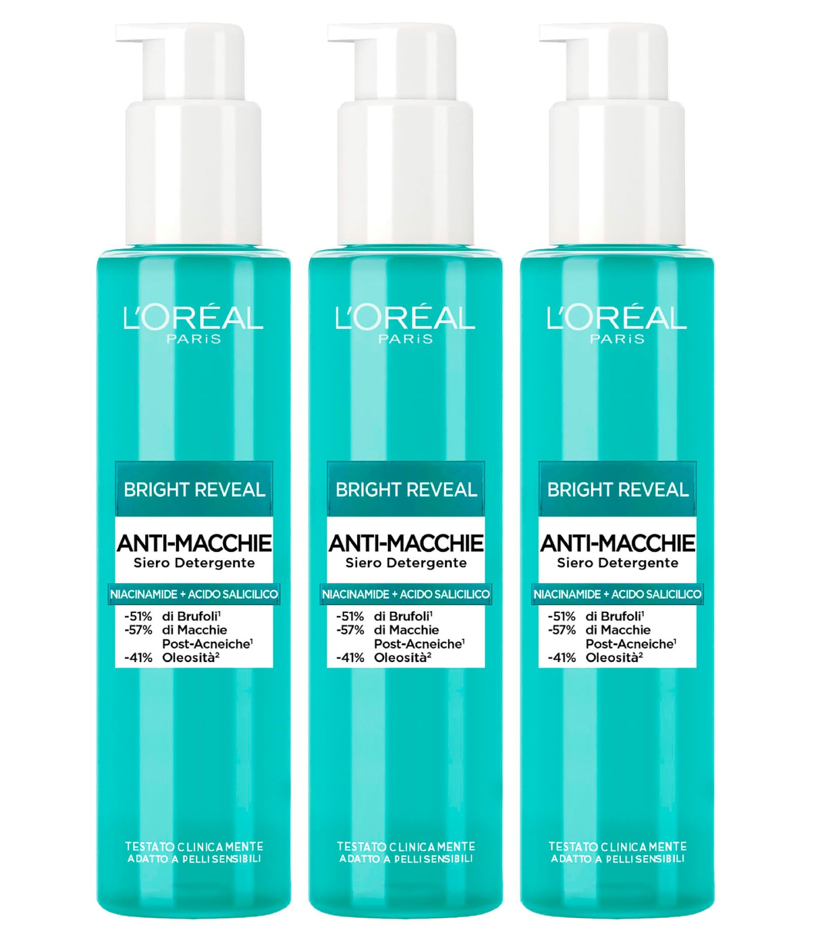 Apply morning and evening by massaging a small amount of product onto damp skin. Rinse with water. Formulated with niacinamide to brighten the skin and salicylic acid, which acts as a gentle exfoliant to reduce dark spots. Clinically tested and suitable for sensitive skin. Delicate, non-greasy texture. Anti-dark spot serum that brightens the skin, reduces blemishes and post-acne marks. Pack of 3 bottles of L'Oréal Paris Bright Reveal Cleansing Serum, 150 ml each.