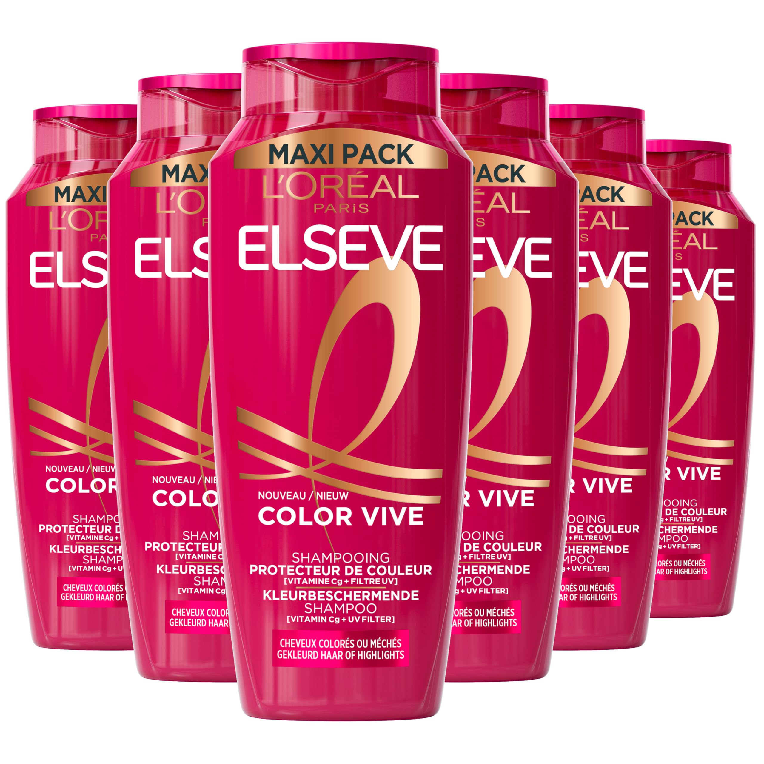 ENRICHED WITH pure Vitamin Cg and UV filters for added protection. RESULT: Intense color lasts up to 40 washes. SUITABLE FOR color-treated hair or highlights. NEW sustainable shampoo packaging with 20 less plastic. L'ORÉAL PARIS ELSEVE COLOR VIVE Shampoo.