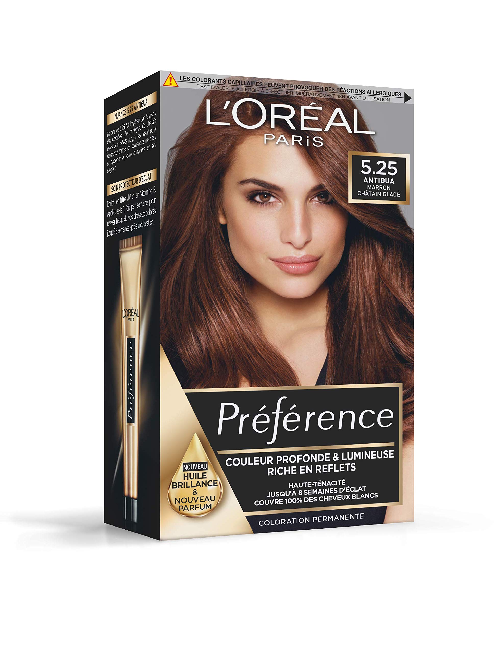 Dare to be colorful with Préférence! A deep, luminous color rich in highlights for intense, expert color results. A new shine oil enriched with precious flowers is included in the kit. The Préférence gel-cream formula, combined with this oil, reveals the full radiance and beauty of your color for up to 8 weeks. A new floral fragrance with amber notes for a more sensorial and pleasant experience. Covers up to 100 of gray hair. Perform an allergy test 48 hours before applying each color. Cover your shoulders with a towel to protect them from any potential splashes. Put on the high-quality gloves. INGREDIENTS Coloring gel: aqua water, trideceth-2 carboxamide mea, propylene glycol, hexylene glycol, peg-2 oleamine, polyglyceryl-4 oleyl ether, oleyl alcohol, alcohol denat, ammonium hydroxide, polyglyceryl-2 oleyl ether, oleic acid, sodium diethylaminopropyl cocoaspartamide, 2.4-diaminophenoxyethanol hci, m-aminophenol, 2-amino-3-hydroxypyridine, sodium metabisulfite, hydroxypropyl bis(n-hydroxyethyl-p-phenylenediamine) hcl, eugenol, ammonium acetate, pentasodium pentetate, linalool, p-phenylenediamine, alpha-isomethyl ionone, resorcinol, erythorbic acid, perfume fragrance (c32818 1). Cream developer: aqua water, hydrogen peroxide, cetearyl alcohol, sodium stannate, trideceth-2 carboxamide mea, pentasodium pentetate, phosphoric acid, ceteareth-25, tetrasodium pyrophosphate, glycerin. (f.i.l. 13169 25). Color enhancing treatment: aqua water, cetearyl alcohol, glycerin, behentrimonium chloride, candelilla cera candelilla wax, amodimethicone, cetyl esters, isopropyl alcohol, tocopheryl acetate, alcohol denat., lecithin, tocopherol, oleth-10, phenoxyethanol, ppg-5-ceteth-20, ethylhexyl salicylate, ethylparaben, trideceth-12, chlorhexidine dihydrochloride, camphor benzalkonium methosulfate, limonene, linalool, benzyl alcohol, benzyl benzoate, phosphoric acid, geraniol, disodium cocoamphodipropionate, methylparaben, cetrimonium chloride, citronellol, hexyl cinnamal, amyl cinnamal, parfum fragrance. (c18845 . INSTRUCTIONS FOR USE 1) Perform an allergy test before applying the product. Cover your shoulders with a towel. 3) Wear gloves. 4) Check for gray hair coverage. See moreContents: 1x L'Oréal Paris Préférence Permanent Hair Color, Antigua (5.25). Includes: 1 bottle of color gel (60 ml), 1 applicator bottle with developer (90 ml), 1 tube of shine protectant (54 ml), 1 shine oil, 1 instruction leaflet, and 1 pair of gloves. Gel-cream formula. Shine oil included to enhance color radiance. Floral fragrance with amber notes for a delightful sensory experience during application. Directions for use: Perform an allergy test 48 hours before application. Read the instructions carefully before use. Recommended quantity: 1 box (medium-length hair), 2 boxes (long hair). Result: Expert results rich in highlights, a subtle, luminous color with many nuances. Up to 100 gray coverage. Does not wash out with shampoo. Permanent hair colour in a light iridescent brown shade with subtle golden highlights, Suitable for blonde to brown hair, Up to 8 weeks of shine.PREFERENCE L'Oréal Paris Préférence Coloration Permanente Cheveux, Nuance : Antigua (5.25), Marron Chocolat GlacéDESCRIPTION DU PRODUIT DESCRIPTION DU PRODUIT Osez la couleur avec Préférence ! Une couleur profonde, lumineuse et riche en reflets au résultat couleur expert intense. Une nouvelle huile de brillance enrichie en fleurs précieuses inclus dans le kit. La formule gel-crème de Préférence associée à cette huile révèle tout l'éclat et la beauté de votre couleur jusqu'à 8 semaines. Un nouveau parfum floral aux notes ambrées pour une expérience plus sensorielle et agréable. Couvre jusqu'à 100 des cheveux blancs. Procéder à un test d'allergie 48h avant l'application de chaque coloration. Couvrez vos épaules avec une serviette pour les protéger de toute projection éventuelle. Mettez les gants haute-qualité. INGRÉDIENTS Gel colorant : aqua water, trideceth-2 carboxamide mea, propylene glycol, hexylene glycol, peg-2 oleamine, polyglyceryl-4 oleyl ether, oleyl alcohol, alcohol denat, ammonium hydroxide, polyglyceryl-2 oleyl ether, oleic acid, sodium diethylaminopropyl cocoaspartamide, 2.4-diaminophenoxyethanol hci, m-aminophenol, 2-amino-3-hydroxypyridine, sodium metabisulfite, hydroxypropyl bis(n-hydroxyethyl-p-phenylenediamine) hcl, eugenol, ammonium acetate, pentasodium pentetate, linalool, p-phenylenediamine, alpha-isomethyl ionone, resorcinol, erythorbic acid, parfum fragrance (c32818 1). Révélateur crème : aqua water, hydrogen peroxide, cetearyl alcohol, sodium stannate, trideceth-2 carboxamide mea, pentasodium pentetate, phosphoric acid, ceteareth-25, tetrasodium pyrophosphate, glycerin. (f.i.l. 13169 25). Soin sublimateur de couleur : aqua water, cetearyl alcohol, glycerin, behentrimonium chloride, candelilla cera candelilla wax, amodimethicone, cetyl esters, isopropyl alcohol, tocopheryl acetate, alcohol denat., lecithin, tocopherol, oleth-10, phenoxyethanol, ppg-5-ceteth-20, ethylhexyl salicylate, ethylparaben, trideceth-12, chlorhexidine dihydrochloride, camphor benzalkonium methosulfate, limonene, linalool, benzyl alcohol, benzyl benzoate, phosphoric acid, geraniol, disodium cocoamphodipropionate, methylparaben, cetrimonium chloride, citronellol, hexyl cinnamal, amyl cinnamal, parfum fragrance. (c18845 . MODE D'EMPLOI 1) Faites un test d'allergie avant d'appliquer le produit. Couvrir les épaules avec une serviette. 3) Porter des gants. 4) Vérifiez la couverture des cheveux gris. Voir plusContenu : 1x Coloration Permanente L'Oréal Paris Préférence, Antigua (5.25), Inclus : 1 flacon de gel colorant (60 ml), 1 flacon applicateur avec révélateur (90 ml), 1 tube de protecteur d'éclat (54 ml), 1 huile de brillance, 1 notice et 1 paire de gants. Formule gel-crème, Huile de brillance incluse pour révéler l'éclat de la couleur, Parfum floral aux notes ambrées pour un plaisir sensoriel à l'application. Consei