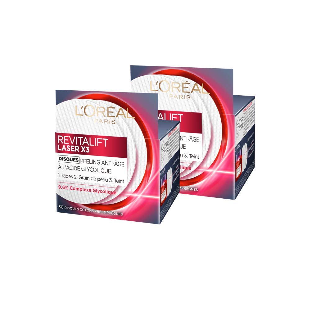 Anti-aging peeling pads, suitable for all skin types, dermatologically tested INGREDIENTS 782867 19 - INGREDIENTS: AQUA WATER. ALCOHOL DENAT. HYDROXYETHYLPIPERAZINE ETHANE SULFONIC ACID. PROPYLENE GLYCOL. GLYCERIN. GLYCOLIC ACID. SODIUM HYDROXIDE. CITRIC ACID. PPG-26-BUTETH-26. PEG-40 HYDROGENATED CASTOR OIL. ALLANTOIN. ASCORBYL GLUCOSIDE. BIOSACCHARIDE GUM-1. PANTHENOL. PHENOXYETHANOL. LINALOOL. LIMONENE. HEXYL CINNAMAL. BENZYL SALICYLATE. PARFUM FRAGRANCE (F.I.L. B214799 1). The ingredient lists for our brand's products are regularly updated. Before using any of our products, please read the ingredient list on the packaging to ensure the ingredients are suitable for your personal use. INSTRUCTIONS FOR USE On skin cleansed with your usual cleanser, gently apply the pad in circular motions to your face and neck, avoiding the eyes and lips. The pad is pre-moistened there is no need to add any other product. Do not rinse allow the product to absorb into the skin. Then apply your Revitalift Laser X3 treatment. To prevent the pads from drying out, close the container tightly after use. See more30 double-sided pre-moistened cotton pads: - Textured side: for more intense exfoliation - Smooth side: for gentler exfoliation. In the evening, on skin cleansed with your usual cleanser, gently apply the pad in circular motions to your face and neck, avoiding the eyes and lips. Pre-moistened pad: no need to add any additional product. Do not rinse and allow the product to absorb into the skin. Then apply your REVITALIFT Laser X3 treatment. TO PREVENT THE PADS FROM DRYING OUT, CLOSE THE CONTAINER TIGHTLY AFTER USE. Removes dead skin cells, allows for better absorption of your daily anti-aging treatment, reduces wrinkles, and evens skin tone. The high concentration of glycolic acid in the anti-aging peeling pads weakens the protein bonds that hold dead skin cells to the surface of the skin, making them easier to remove. Inspired by dermatological peeling procedures, Revitalift Laser X3 Anti-Aging Peeling Discs are enriched with glycolic acid to help remove dead cells, allow better absorption of your daily anti-aging treatment, reduce wrinkles and even out skin tone.L'Oréal Paris - Disques Peeling Anti-Âge (x 30) - Revitalift Laser X3 - À l'acide Glycolique - Lot de 2DESCRIPTION DU PRODUIT DESCRIPTION DU PRODUIT Disques peeling anti-âge, Usage quotidien adapté à tous les types de peaux, Testé sous contrôle dermatologique INGRÉDIENTS 782867 19 - INGREDIENTS: AQUA WATER. ALCOHOL DENAT. HYDROXYETHYLPIPERAZINE ETHANE SULFONIC ACID. PROPYLENE GLYCOL. GLYCERIN. GLYCOLIC ACID. SODIUM HYDROXIDE. CITRIC ACID. PPG-26-BUTETH-26. PEG-40 HYDROGENATED CASTOR OIL. ALLANTOIN. ASCORBYL GLUCOSIDE. BIOSACCHARIDE GUM-1. PANTHENOL. PHENOXYETHANOL. LINALOOL. LIMONENE. HEXYL CINNAMAL. BENZYL SALICYLATE. PARFUM FRAGRANCE (F. I. L. B214799 1). Les listes d'ingrédients entrant dans la composition des produits de notre marque sont régulièrement mises à jour. Avant d'utiliser un produit de notre marque, vous êtes invités à lire la liste d'ingrédients figurant sur son emballage afin de vous assurer que les ingrédients sont adaptés à votre utilisation personnelle MODE D'EMPLOI Sur une peau nettoyée avec le nettoyant habituel, appliquez délicatement le disque pour des mouvements circulaires sur le visage et le cou, en évitant les yeux et les lèvres. Le disque est pré-imprégné, il n'est pas nécessaire d'ajouter un autre produit. Ne pas rincer et laisser le produit pénétrer dans la peau. Appliquez ensuite votre soin Revitalift Laser X3. Pour éviter que les disques ne sèchent, fermez bien le bocal après utilisation. Voir plus30 disques cotons pré-imprégnés double-face : - Face striée : pour une exfoliation plus intense - Face lisse : pour une exfoliation plus douce. Le soir, sur une peau démaquillée avec votre nettoyant habituel, appliquer doucement le disque par mouvements circulaires sur le visage et le cou, en évitant les yeux et les lèvres. Disque pré-imprégné : pas besoin d'ajouter de produit supplémentaire. Ne pas rincer et laisser le produit pénétrer dans la peau. Appliquer ensuite votre soin REVITALIFT Laser X3. POUR ÉVITER AUX DISQUES DE SÉCHER, BIEN REFERMER LE POT APRÈS USAGE. Elimine les cellules mortes, permet une meilleure absorption de votre soin anti-âge quotidien, réduit les rides et uniformise le teint. La haute concentration d'acide glycolique contenue dans les disques peeling anti-âge permet d'affaiblir les liaisons des protéines retenant les cellules mortes à la surface de la peau, pour mieux les éliminer. Inspirés des procédures dermatologiques de peeling, les Disques Peeling Anti-âge Revitalift Laser X3 sont enrichis en acide glycolique pour aider à éliminer les cellules mortes, permettre une meilleure absorption de votre soin anti-âge quotidien, réduire les rides et uniformiser le teint.