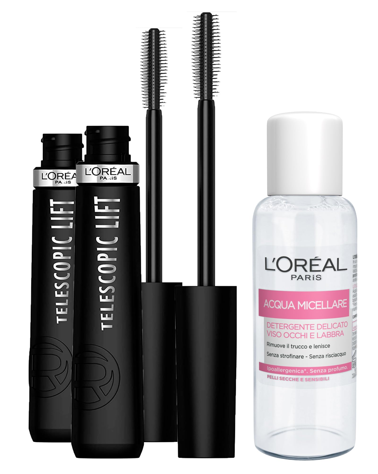 Clump- and smudge-proof texture with moisturizing properties. Long-lasting vegan formula enriched with a ceramide complex. Double-hook bristle brush to grip and lift lashes. Mascara that adds volume and length to lashes, up to 5 mm more. The kit contains: 2 L'Oréal Paris Telescopic Lift volumizing and lengthening mascaras in black.