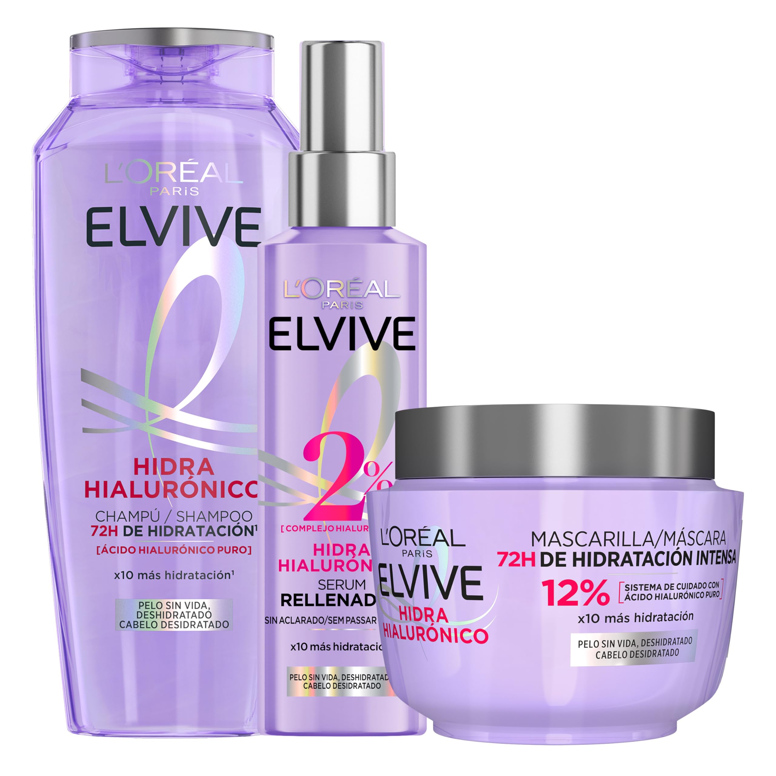 Contents: 1 L'Oréal Paris Hydra Hyaluronic Shampoo 72h Hydration 1 72h Intensive Hydration Mask 1 Filling Serum. Apply the Hydra Hyaluronic Shampoo followed by the mask from mid-lengths to ends. Finally, apply the serum to add body and fill your hair. Its formula gives you full, vibrant hair, fully hydrated for 72 hours . Instrumental test in shampoo conditioner. Hyaluronic acid is one of the most sought-after ingredients in skincare. A molecule naturally present in the skin capable of retaining more than 1000 times its weight in water. L'Oréal Paris Hydra Hyaluronic is the new range with Hyaluronic Acid for all hair types, especially those that need a hydration boost.