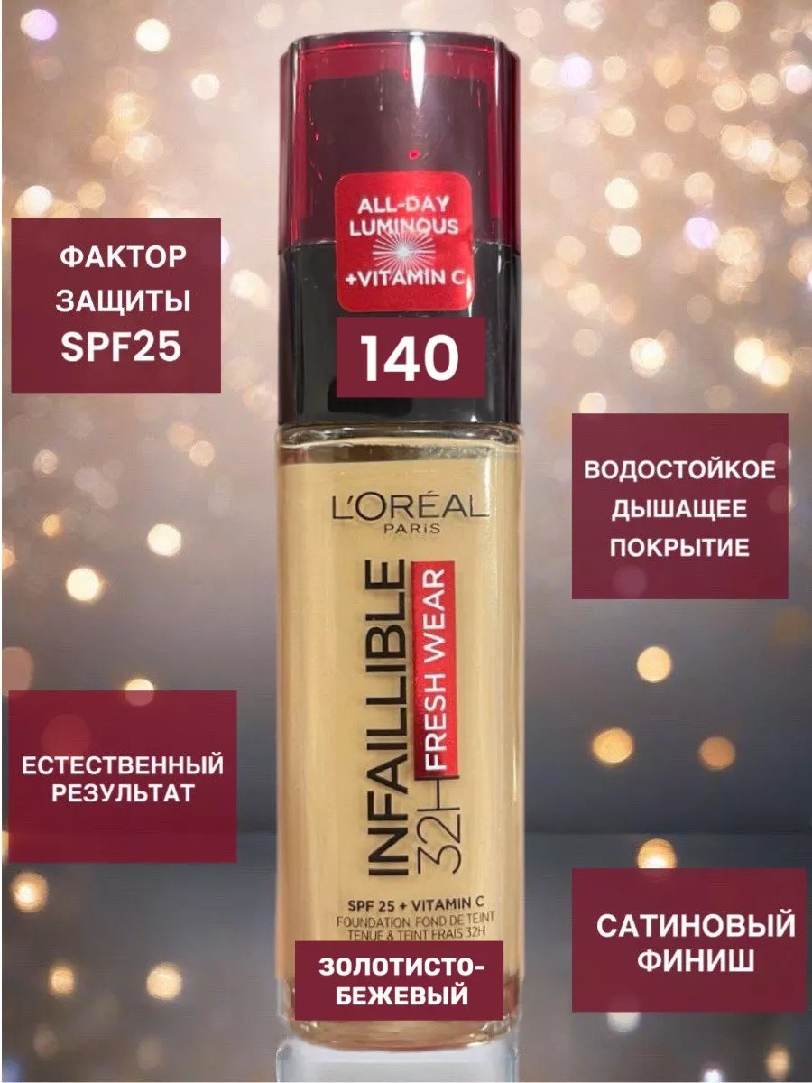 Французский улажняющий тональный крем для лица INFAILLIBLE 32Ч СВЕЖИЙ ТОН от L'Oreal Paris идеальное тональное средство для создания ровного и естественного макияжа. Tональник стойкий и не скатывается даже в летнюю жару, обеспечивает матирующий эффект и свежий тон 32 часа. Прекрасно ложится на кожу, увлажняет и питает её и создает идеальную основу для макияжа. Защитите свою кожу от вредного воздействия ультрафиолетовых лучей с помощью встроенной UV-защиты и ухаживающих компонентов. В составе витамин C, способствующий осветлению и улучшению цвета кожи, и перламутровые пигменты, которые добавляют природный блеск, придают лицу свежий и сияющий вид. Средство имеет легкую жидкую кремовую текстуру, которая быстро впитывается и выравнивает тон кожи, придавая ей нежный и свежий вид. Основа помогает скрыть любые несовершенства кожи, такие как следы от прыщей, покраснений и пигментации, при этом не создаёт эффекта маски. Infaillible имеет солнцезащитный фактор SPF 25, что делает его универсальным для использования в любое время года. Крем ухаживающий комплекс для увлажнения и защиты, обеспечивает антивозрастной уход за кожей. Он не плотный и обладает легким покрытием, при этом стойкий. Не сушит кожу и придает лицу здоровое сияние. Выравнивающий, питательный и защитный эффект помогает не только скрыть несовершенства кожи, но и оказывает лифтинг эффект. Естественный сатиновый финиш придает шелковистость. Тонирующий и матирующий крем подходит как для сухой, чувствительной и нормальной кожи, так и для жирной, комбинированной, проблемной и возрастной кожи. Это лучшая база для выравнивания тона, и эффективный корректор, позволяющий скрыть синяки и мешки под глазами. Тоналка подарит ощущение легкости, увлажнения и комфорта на целый день. Подходит для домашнего и профессионального использования, что делает его идеальным выбором для женщин. Эта декоративная косметика база для женской косметички. Отличная идея подарка на день рождение, день матери, юбилей и на другие праздники.